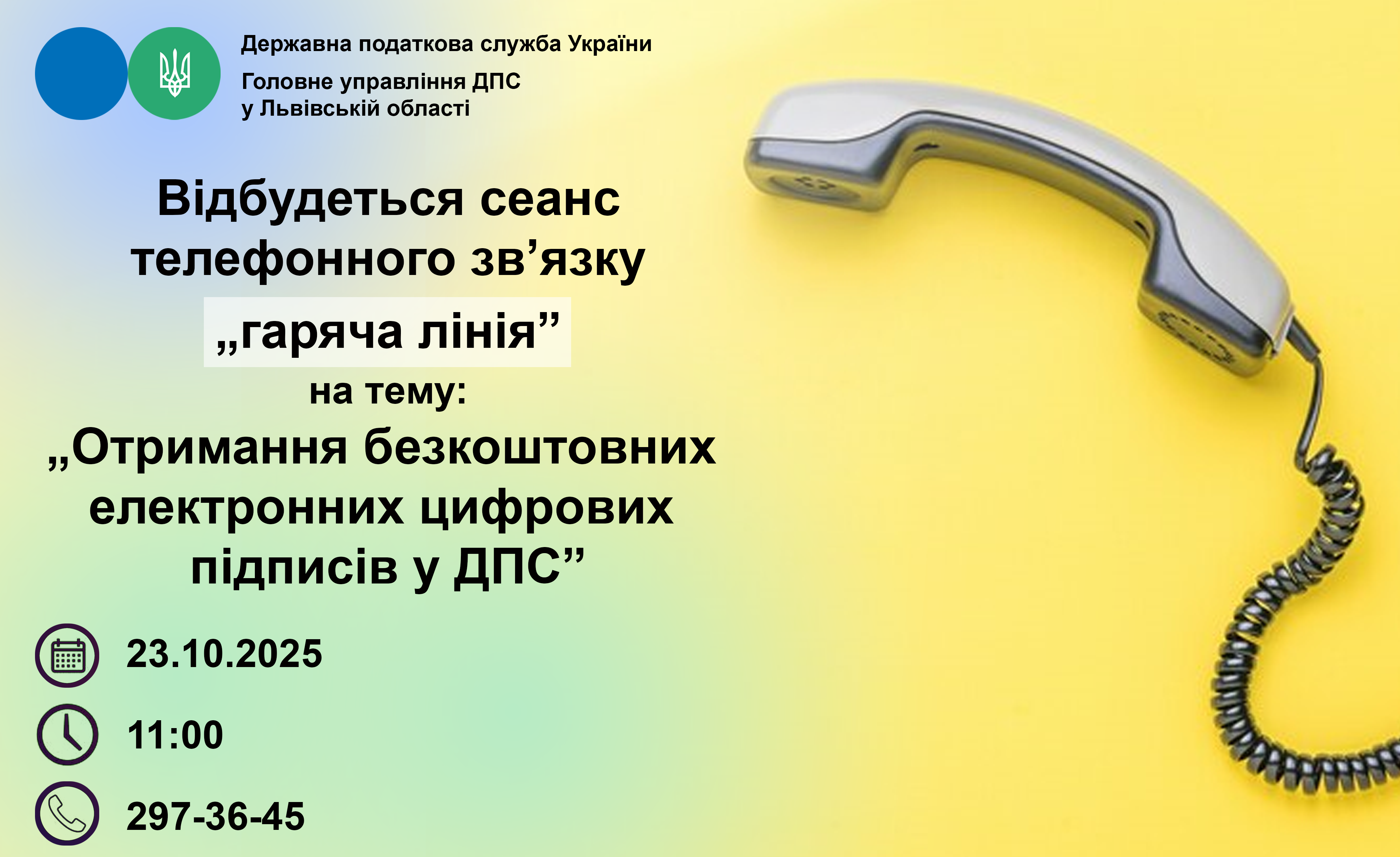 Відбудеться сеанс телефонного зв`язку "гаряча лінія" на тему : "Отримання безкоштовних електронних цифрових підписів у ДПС"