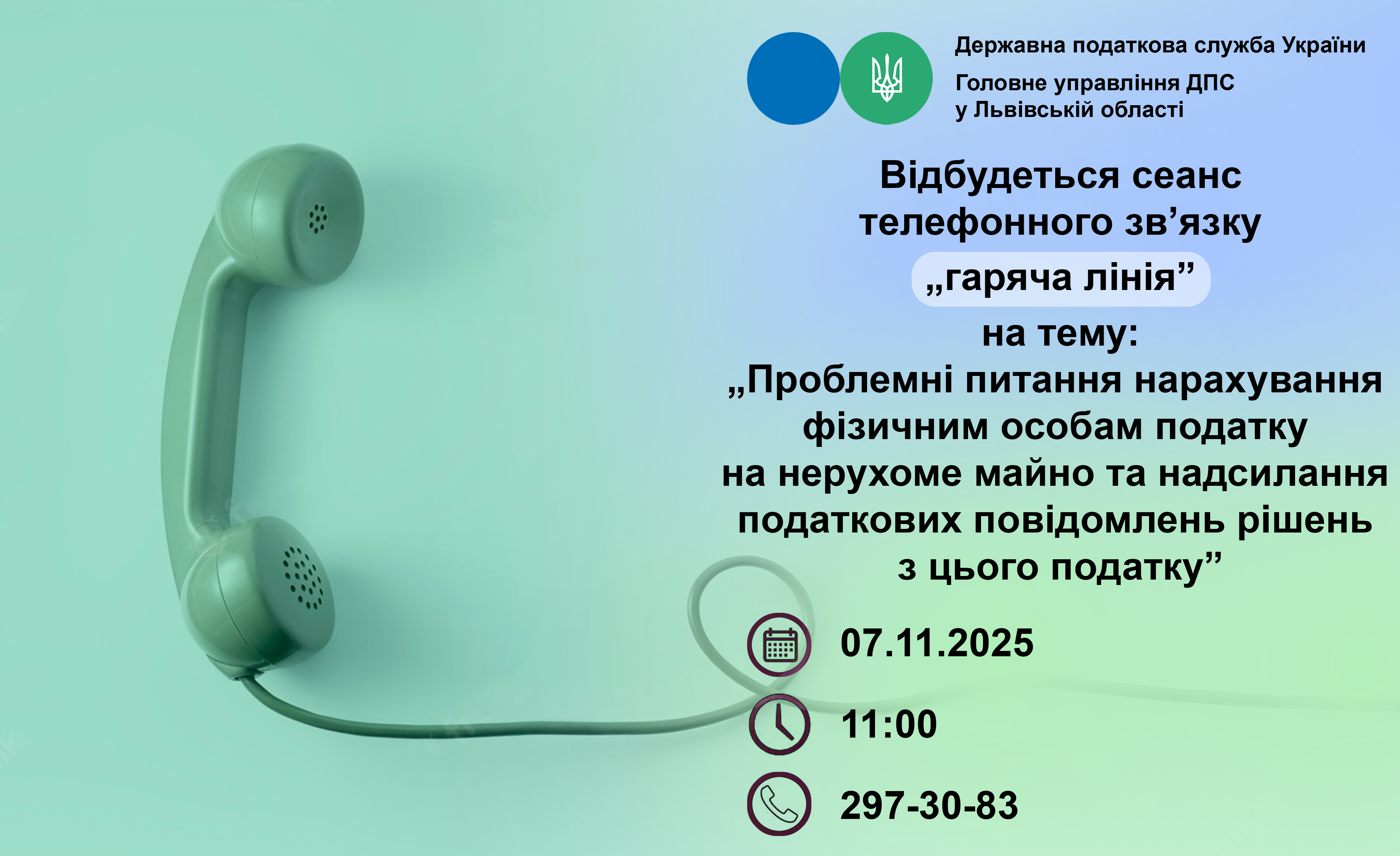 Відбудеться сеанс телефонного зв'язку ,,гаряча лінія” на тему: ,,Проблемні питання нарахування фізичним особам податку на нерухоме майно та отримання ними податкових повідомлень-рішень з цього податку”