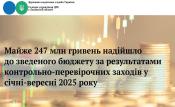 За результатами контрольно-перевірочних заходів у січні-вересні 2025 року донараховано за актами поточного року 1 054,9 млн гривень. За актами звітного та минулих років узгоджено та пред'явлено до сплати грошових зобов’язань на суму 802,2 млн гривень. Мобілізовано до зведеного бюджету 246,9 млн грн (за 9 місяців 2024 року надійшло 227,9 млн грн), в тому числі: ПДВ – 95,3 млн грн, податку на прибуток – 111,5 млн грн, пені за порушення термiнiв розрахунку у сферi ЗЕД - 18,4 млн грн, акцизного податку – 1,3 млн гривень.