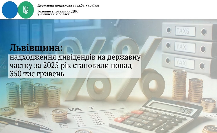 Головне управління ДПС у Львівській області інформує, що за 2025 рік при доведених показниках доходів по надходженню дивідендів (доходу), нарахованих на акцiї (частки) господарських товариств, у статутних капiталах яких є державна власність в сумі 453,7 тис. грн надійшло 350,1 тис. грн або 77,2 відсотка.