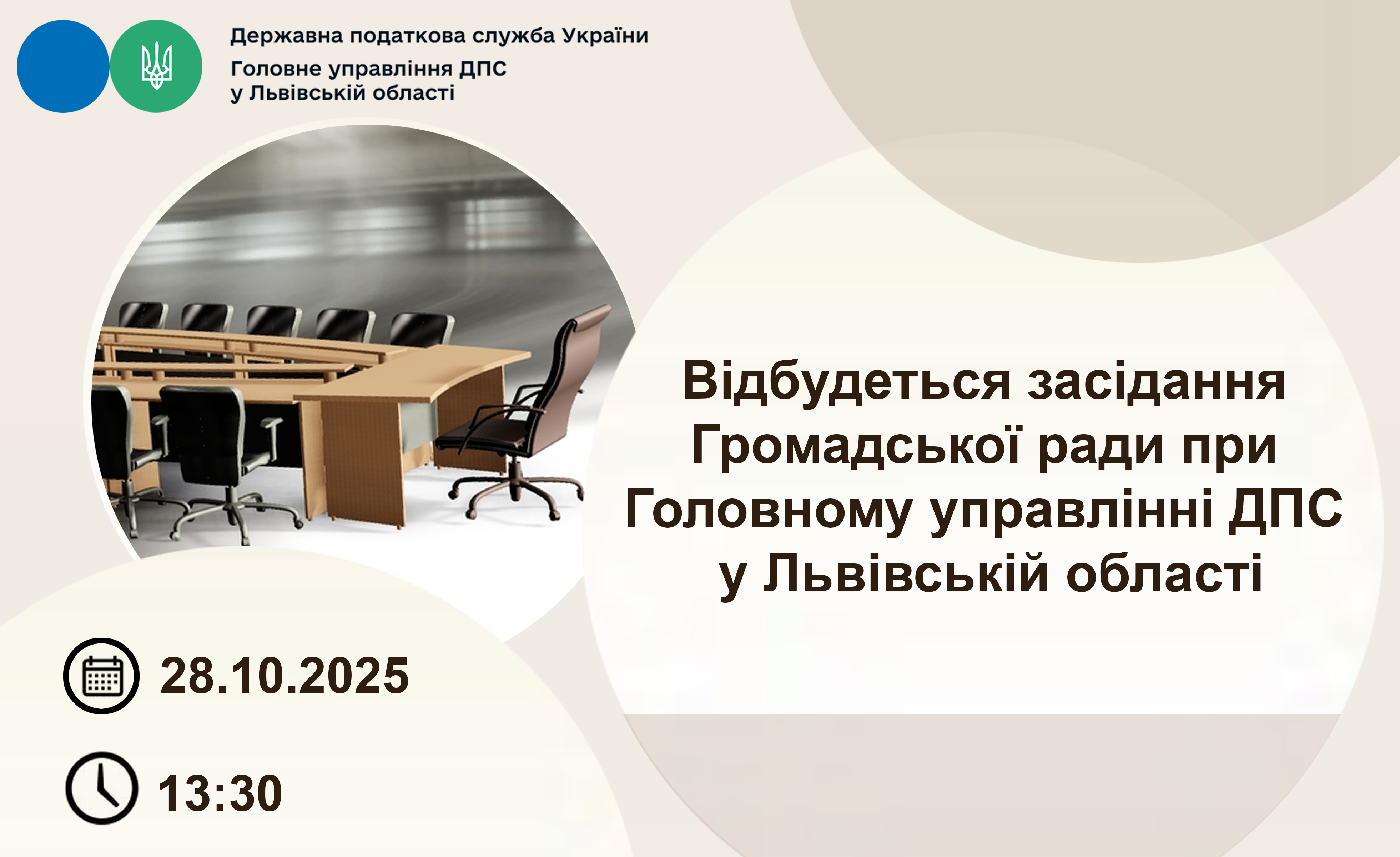 28 жовтня 2025 року о 13:30 год. відбудеться засідання Громадської ради при Головному управлінні ДПС у Львівській області.