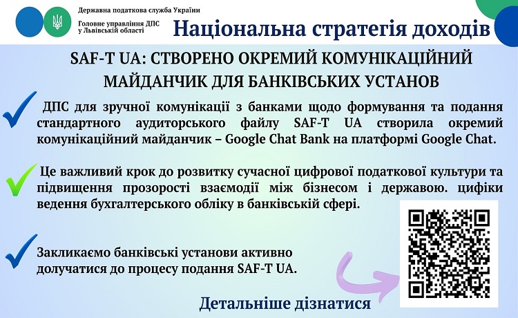 Державна податкова служба для зручної комунікації з банками щодо формування та подання стандартного аудиторського файлу SAF-T UA створила окремий комунікаційний майданчик – Google Chat Bank на платформі Google Chat.