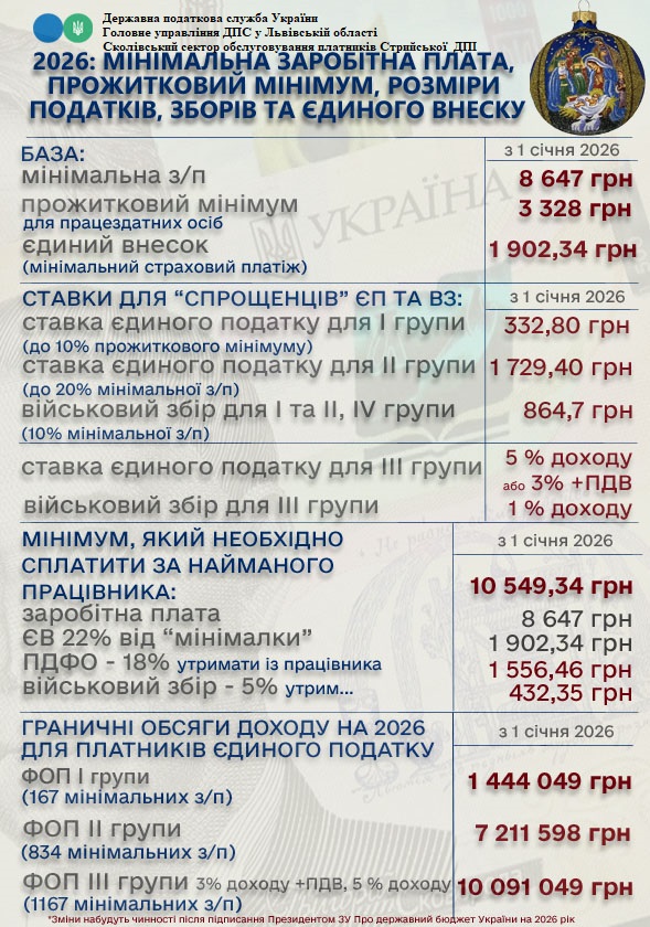 2026: Мінімальна зпробітна плата,прожитковий мінімум, розмір податків, зборів та єдиного внеску