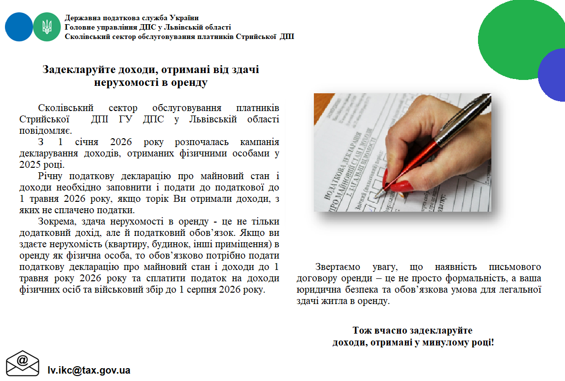 Сколівський сектор обслуговування платників Стрийської ДПІ: Задекларуйте доходи, отримані від здачі нерухомості в оренду