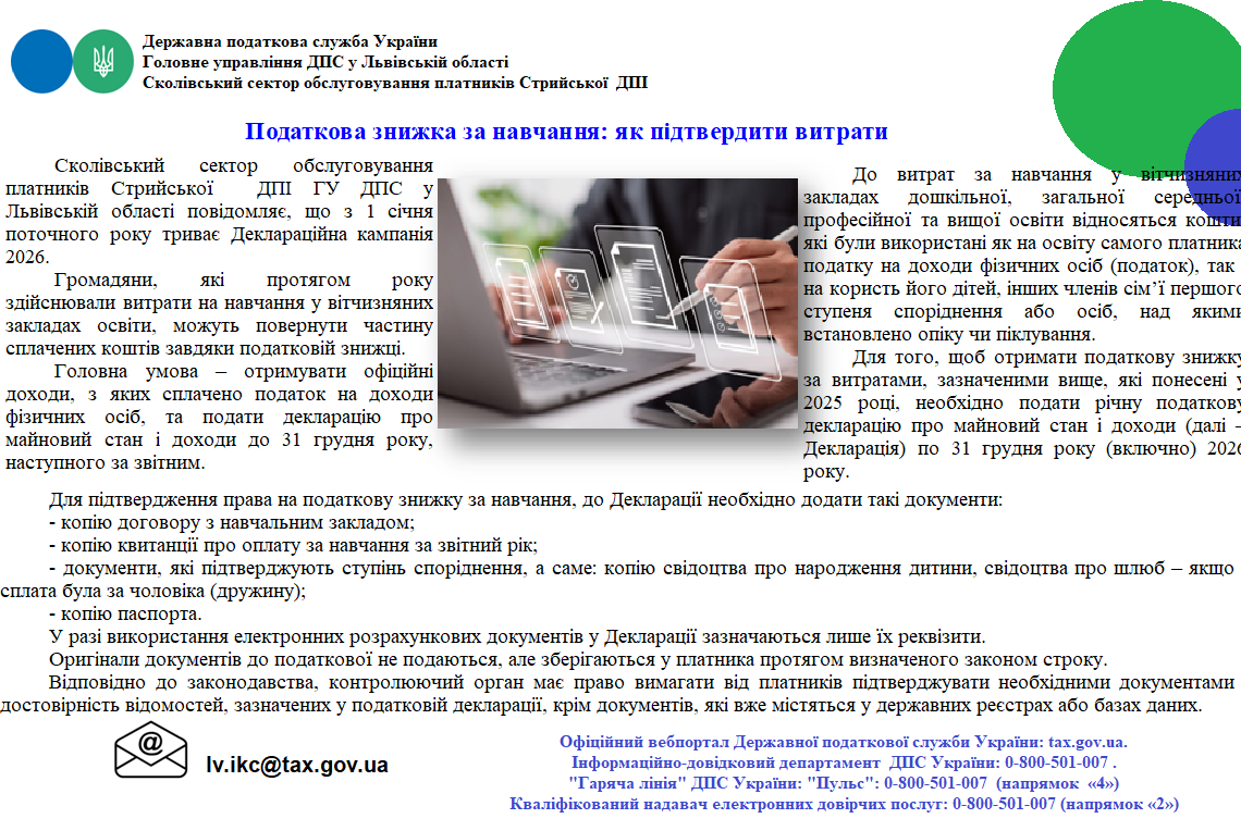 Сколівський сектор обслуговування платників Стрийської ДПІ: Податкова знижка за навчання, як підтвердити?