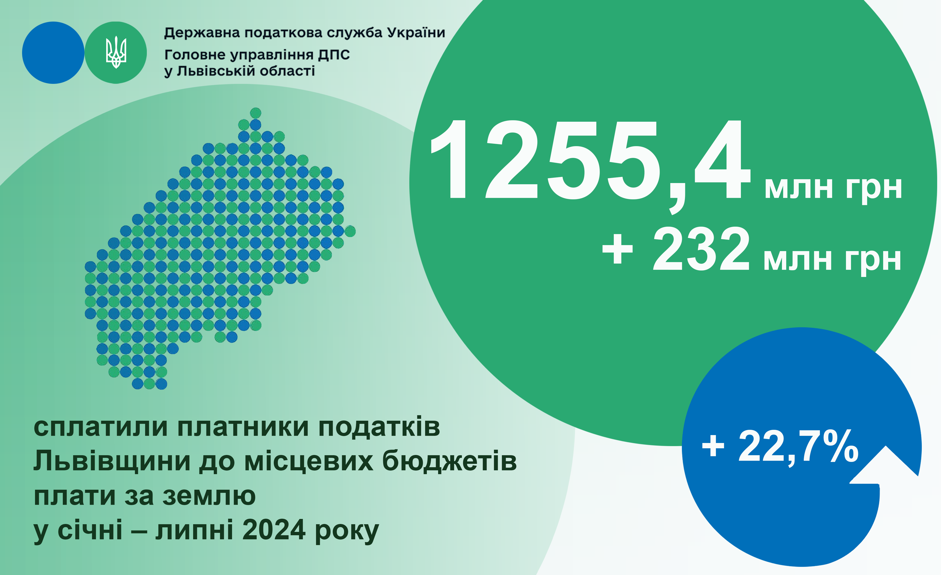 Надходження плати за землю у січні-липні 2024 року становили 1 255,4 млн гривень. Порівняно з відповідним періодом 2023 року вони збільшилися на 23% або на 232 млн гривень.