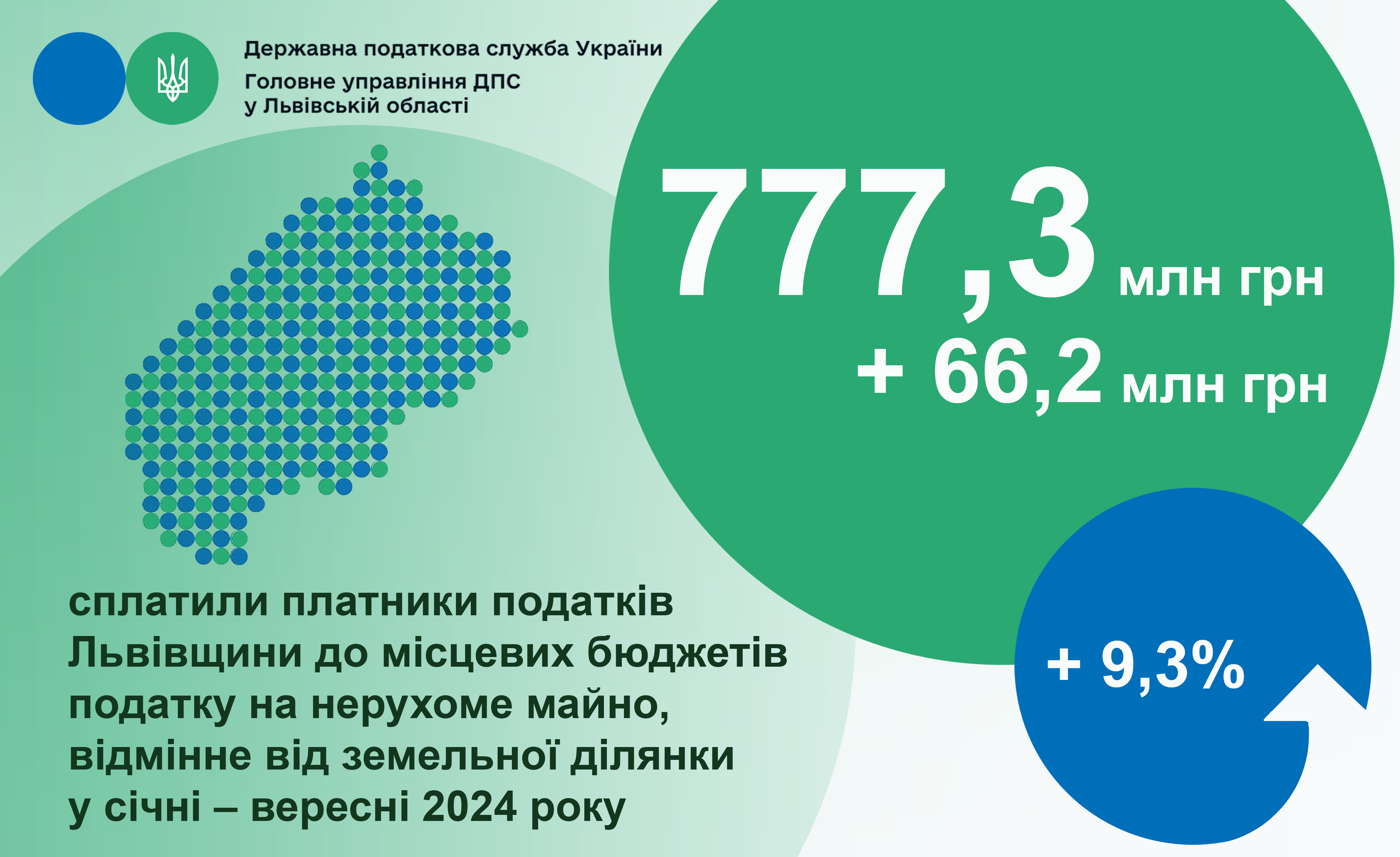 Надходження податку на нерухоме майно, відмінне від земельної ділянки у січні-вересні 2024 року склали 777,3 млн грн, що в порівнянні з відповідним періодом 2023 року на 66,2 млн грн або на 9,3% більше.