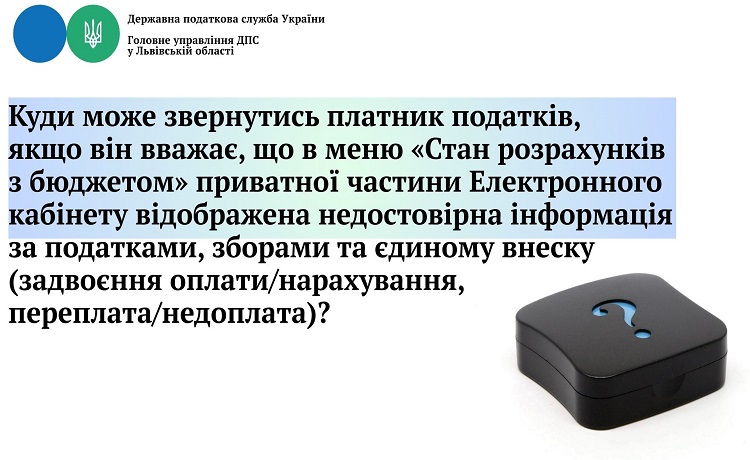 Куди може звернутись платник податків, якщо він вважає, що в меню «Стан розрахунків з бюджетом» приватної частини Електронного кабінету відображена недостовірна інформація за податками, зборами та єдиному внеску (задвоєння оплати/нарахування, переплата/недоплата)?