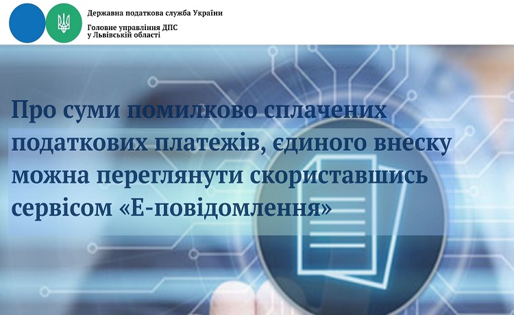 Головне управління ДПС у Львівській області інформує, що з метою підвищення рівня інформування платників податків про суми помилково сплачених податкових платежів, єдиного внеску запроваджено новий сервіс «Е-повідомлення».