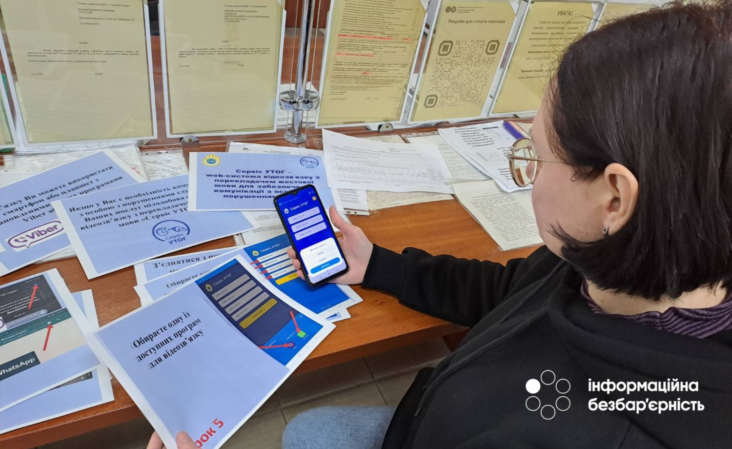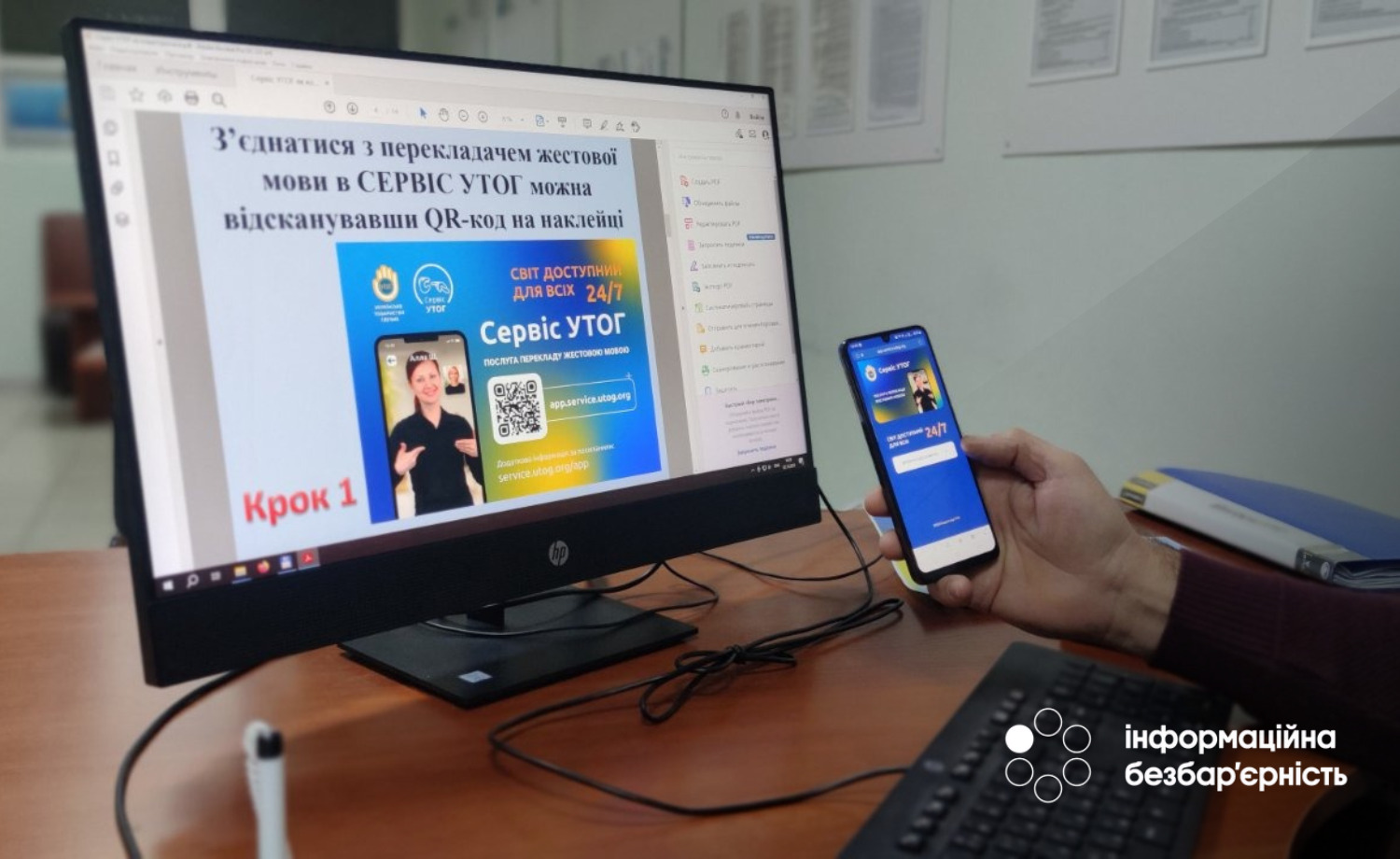Щоб скористатися достатньо лише відсканувати QR-код, щоб отримати доступ до відеозв’язку з професійним перекладачем Українського товариства глухих (УТОГ).