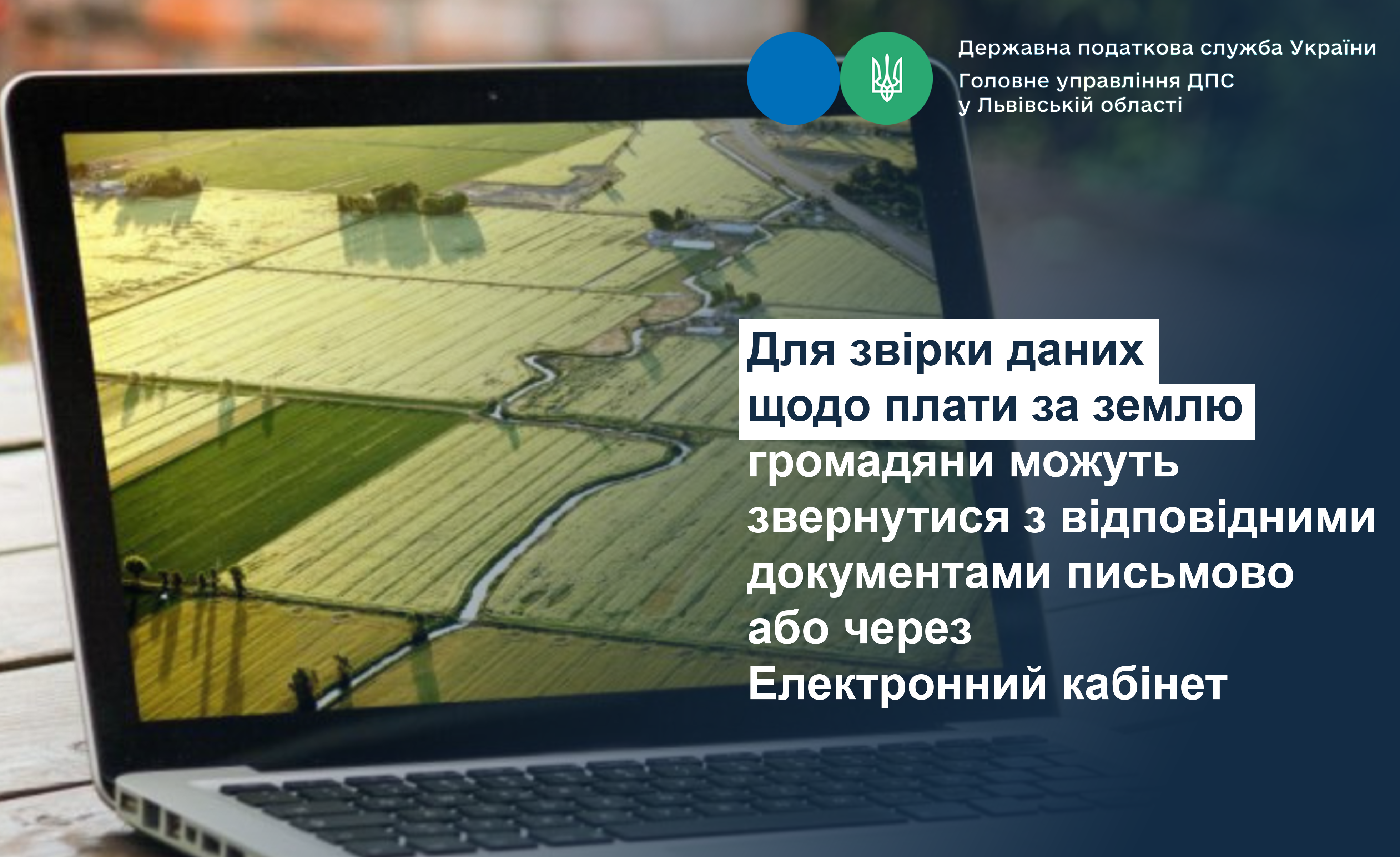 Головне управління ДПС у Львівській області звертає увагу громадян, що для звірки даних щодо плати за землю фізичні особи (громадяни) звертаються із відповідними документами письмово або в електронній формі (через меню «Листування з ДПС» приватної частини Електронного кабінету) за своїм місцем реєстрації або місцем знаходження будь-якої з земельних ділянок.
