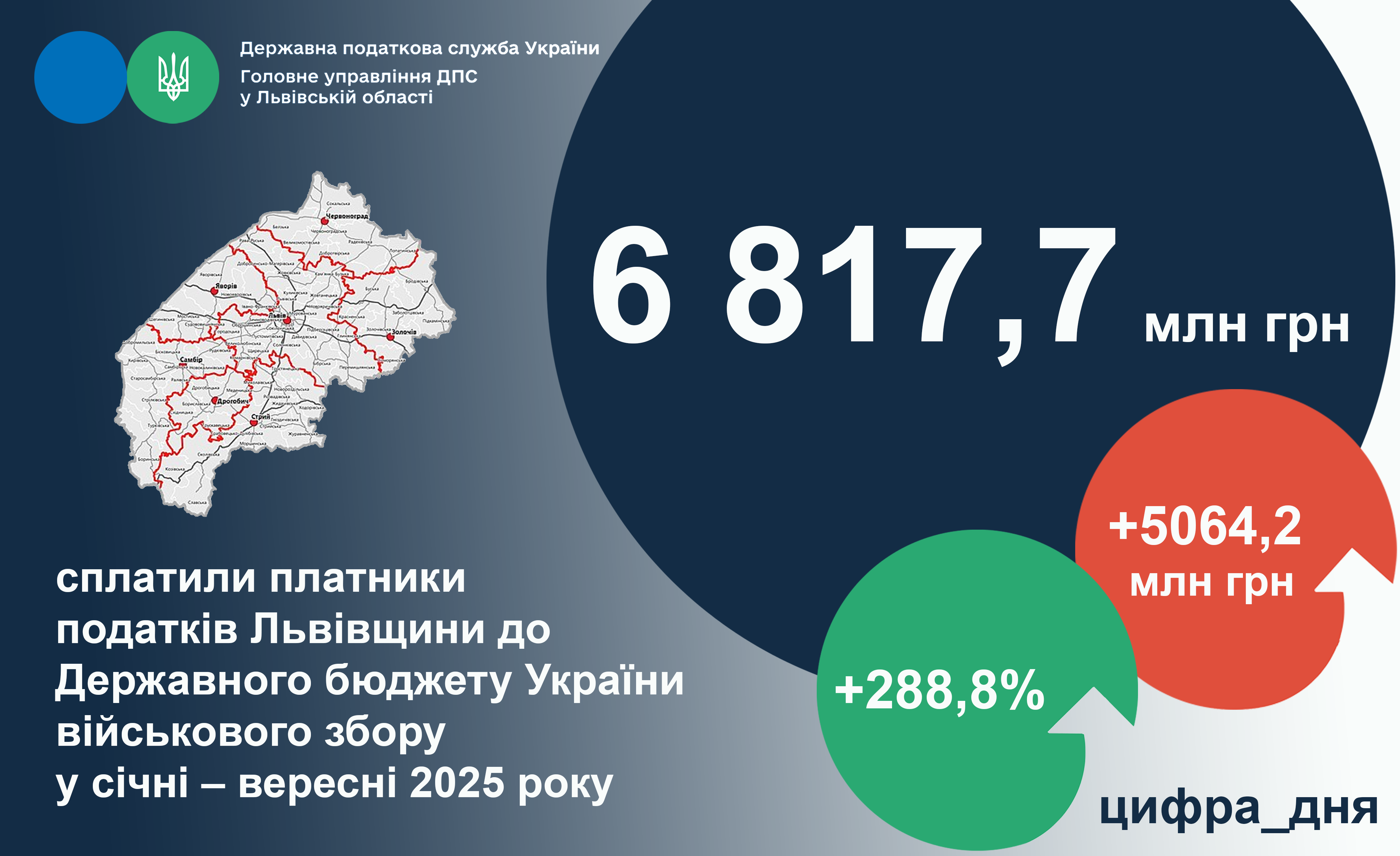 Упродовж січня – вересня 2025 року військового збору надійшло до державного бюджету 6817,7 млн гривень. Це на 288,8% або на 5064,2 млн грн більше порівняно з січнем-вереснем 2024 року.