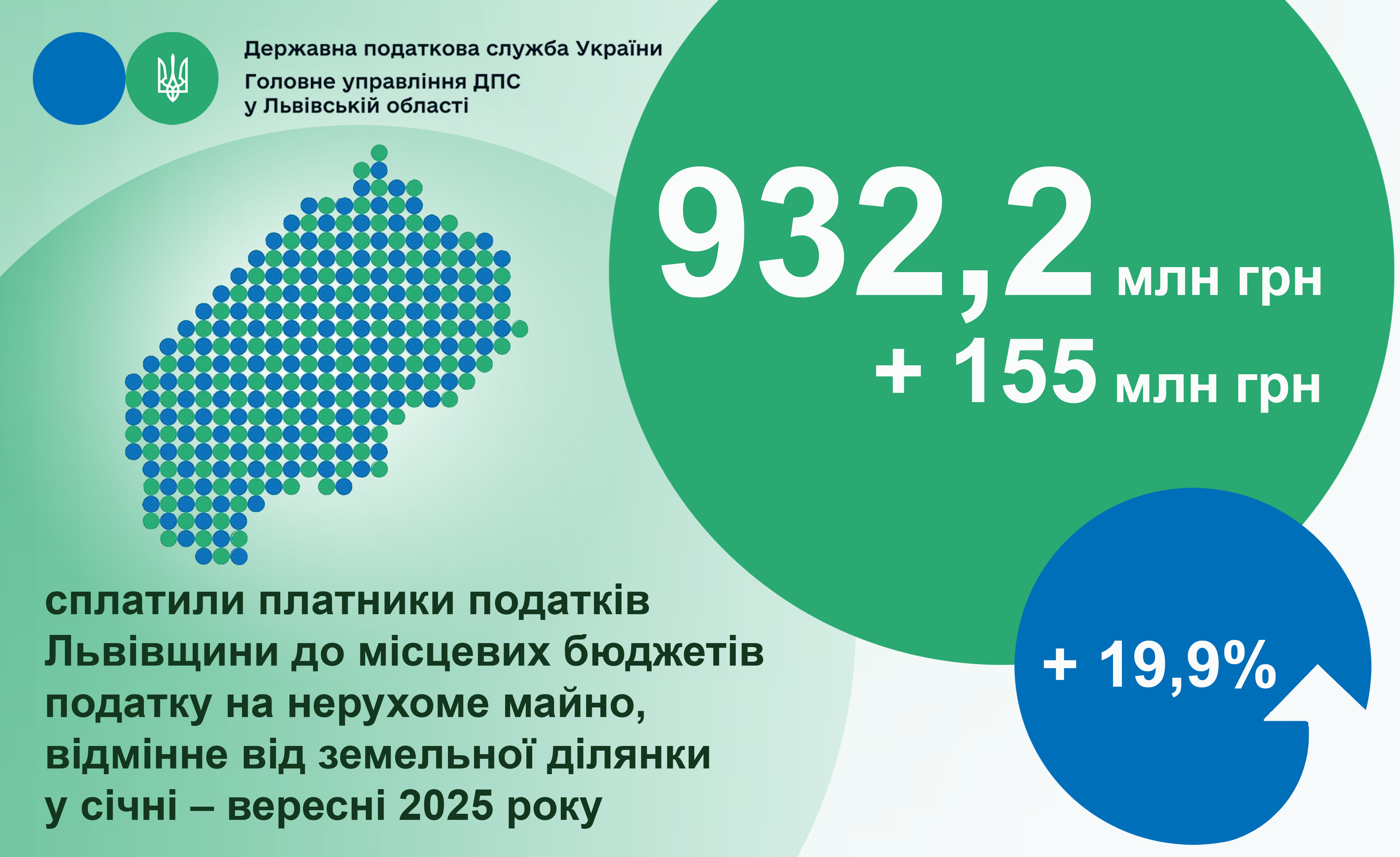 Надходження податку на нерухоме майно, відмінне від земельної ділянки у січні-вересні 2025 року до місцевих громад Львівської області  становили 932,2 млн гривень. Порівняно  з відповідним періодом 2024 року надходження збільшились на 19,9% або на 155,0 млн гривень. Про це повідомив начальник Головного управління ДПС у Львівській області Микола Никитюк.