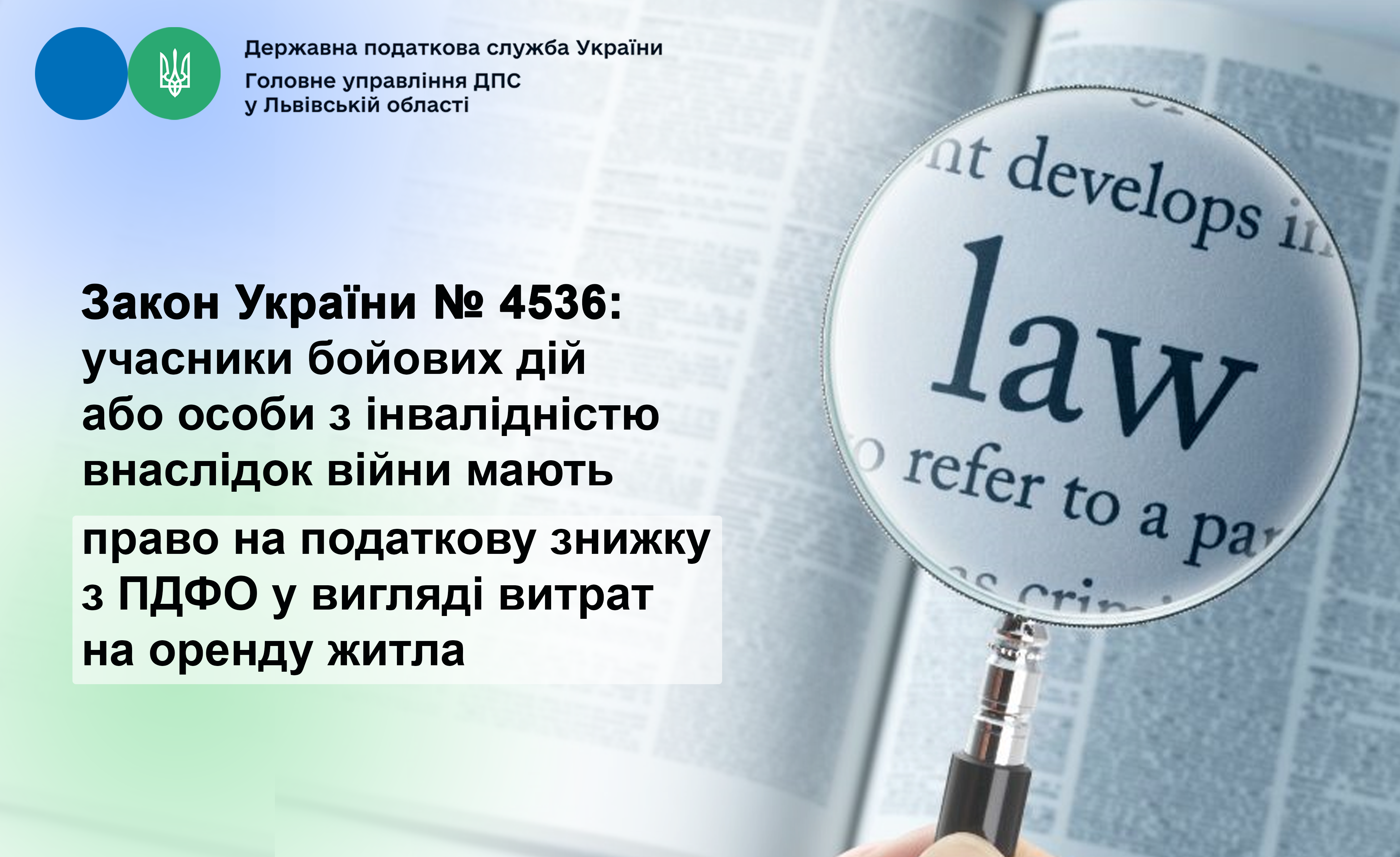 Закон України № 4536: учасники бойових дій або особи з інвалідністю внаслідок війни мають право на податкову знижку з ПДФО у вигляді витрат на оренду житла