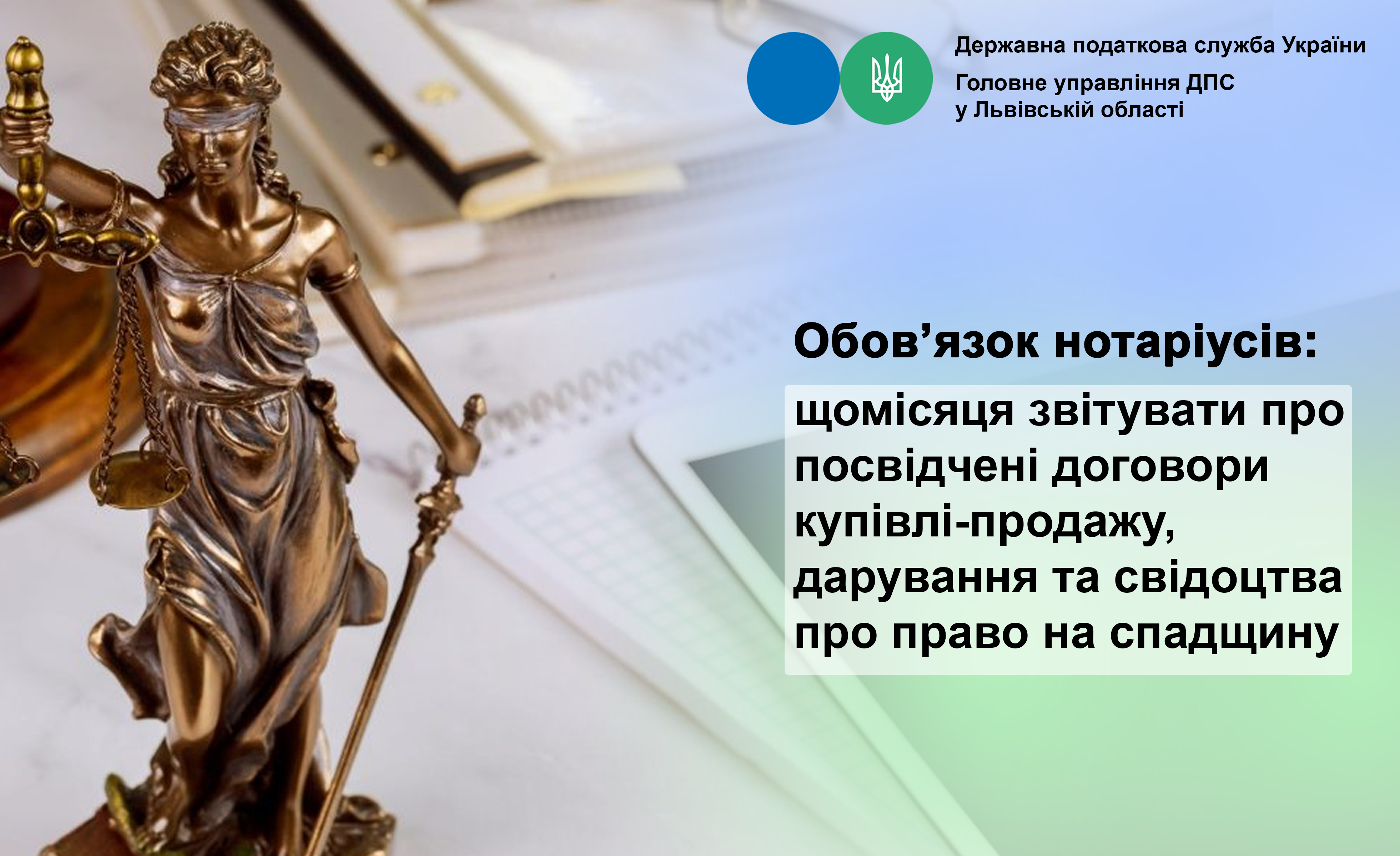 Головне управління ДПС у Львівській області звертає увагу нотаріусів, що вони зобов’язані щомісяця подавати до контролюючого органу інформацію про посвідчені договори купівлі-продажу рухомого і нерухомого майна, дарування та свідоцтва про право на спадщину. Це передбачено змінами, внесеними з 01 січня 2025 року до Податкового кодексу України Законом України від 10 жовтня 2024 року № 4015-ІХ «Про внесення змін до Податкового кодексу України та інших законів України щодо забезпечення збалансованості бюджетних надходжень у період дії воєнного стану».