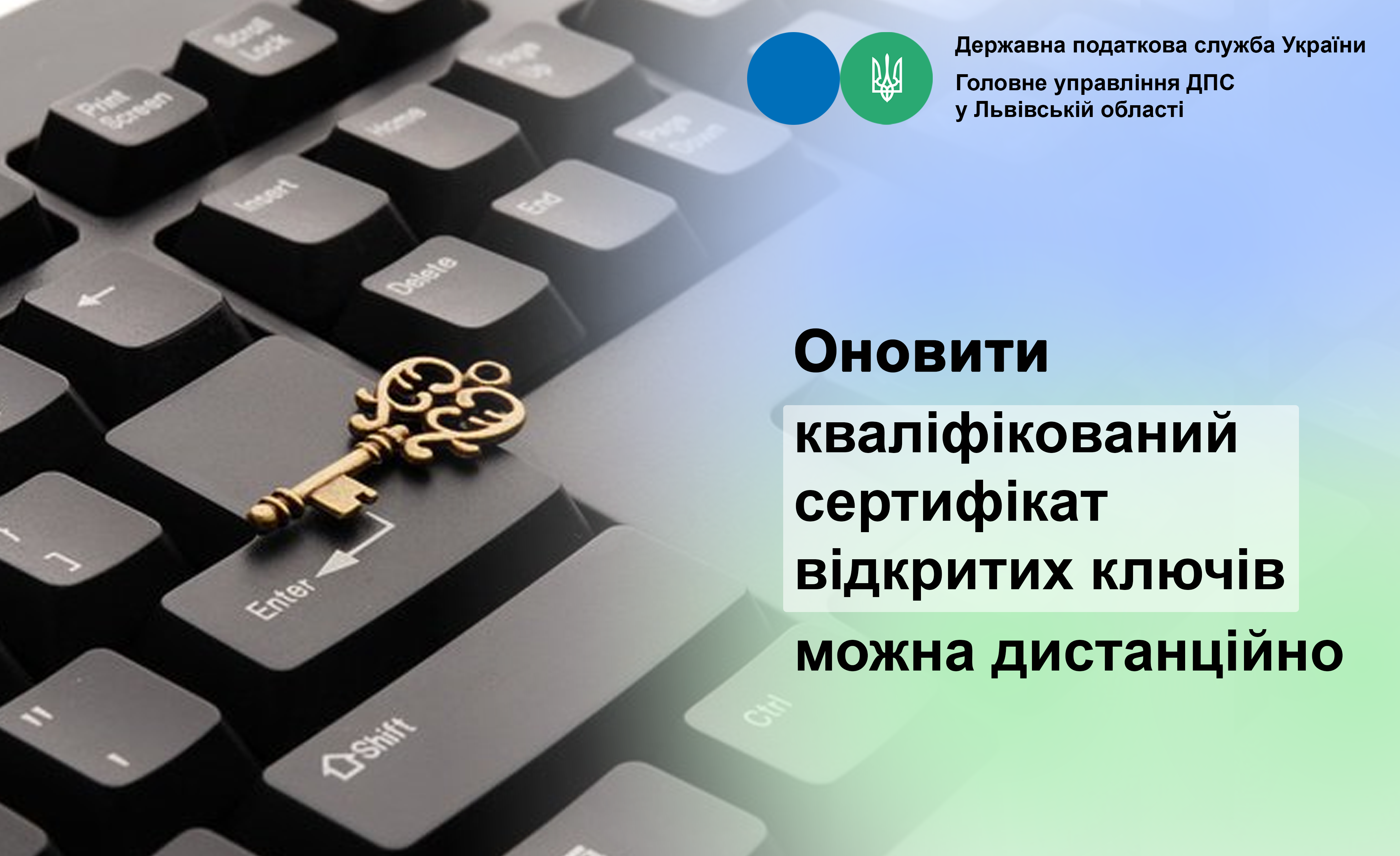 Головне управління ДПС у Львівській області інформує, що оновити кваліфікований сертифікат відкритих ключів можна самостійно всього за кілька хвилин через сервіс (дистанційного) повторного формування сертифікатів за електронним запитом. Дистанційно сформувати нові сертифікати зможуть лише ті користувачі, які мають: