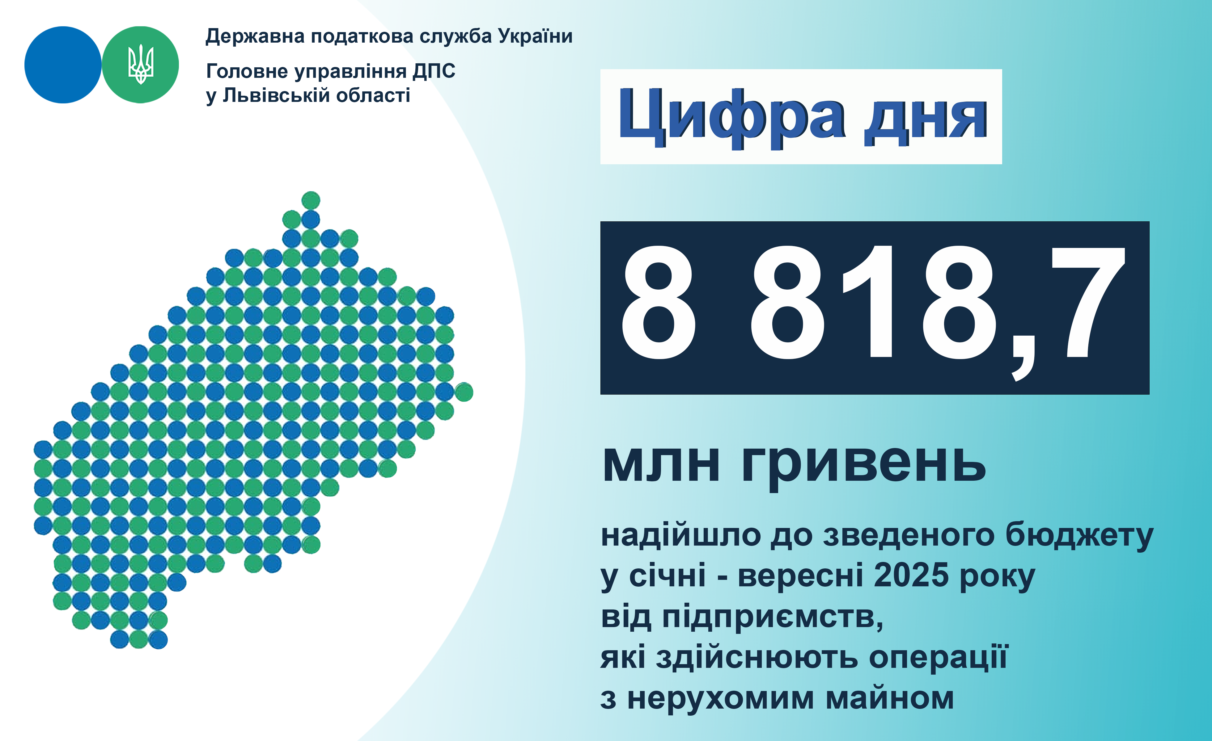 Від підприємств, які здійснюють операції з нерухомим майном (у т.ч. технопарки, ІТ-компанії, надання консалтингових послуг тощо) у січні-вересні 2025 року до зведеного бюджету надійшло 8 818,7 млн грн податкових платежів. Це на 2 029,0 млн грн. або на 29,9 відсотків більше, ніж у січні-вересні 2024 року.