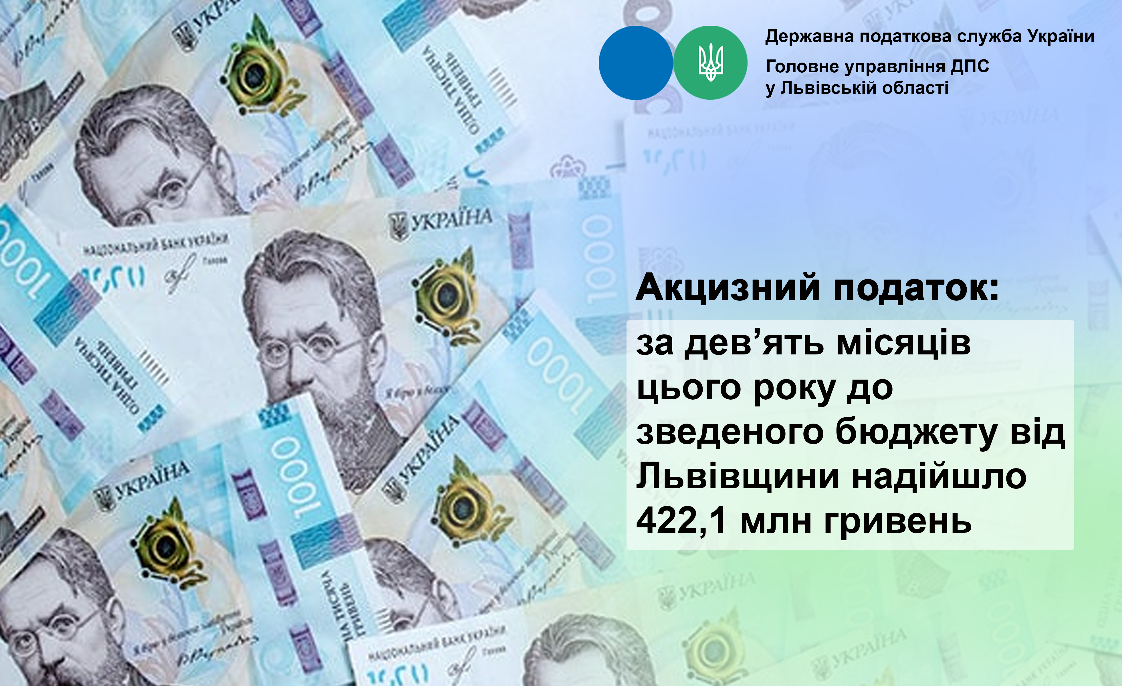 Акцизний податок: за дев’ять місяців цього року до зведеного бюджету від Львівщини надійшло 422,1 млн гривень