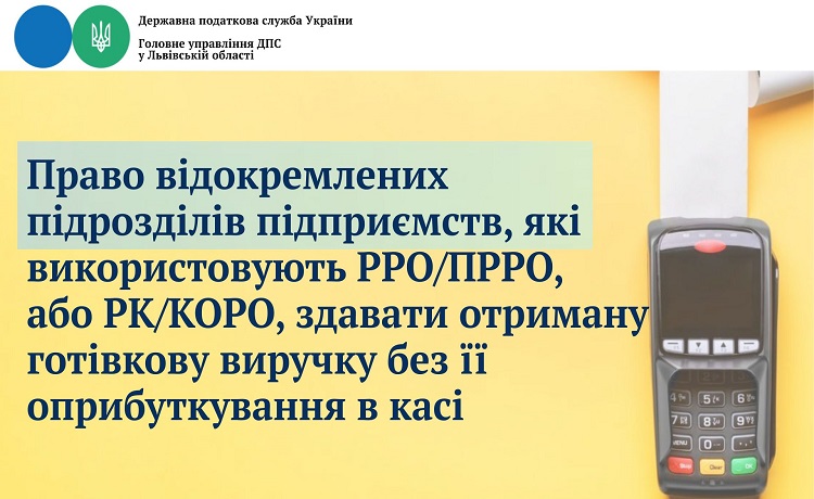 Право відокремлених підрозділів підприємств, які використовують РРО/ПРРО, або РК/КОРО, здавати отриману готівкову виручку без її оприбуткування в касі