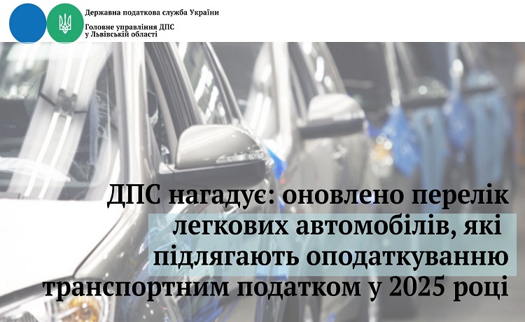 Управління оподаткування фізичних осіб Головного управління ДПС у Львівській області інформує, що у вересні 2025 року на офіційному сайті Міністерства економічного розвитку і торгівлі України оновлено перелік легкових автомобілів, які підлягають оподаткуванню транспортним податком у 2025 році (1362 моделей легкових автомобілів).