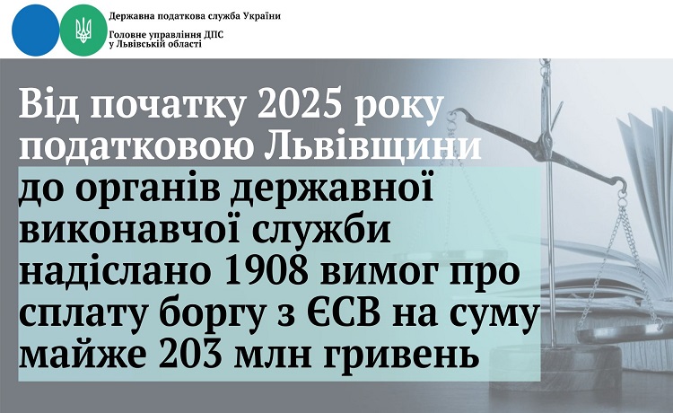 Від початку 2025 року податковою Львівщини до органів державної виконавчої служби надіслано 1908 вимог про сплату боргу з ЄСВ на суму майже 203 млн гривень