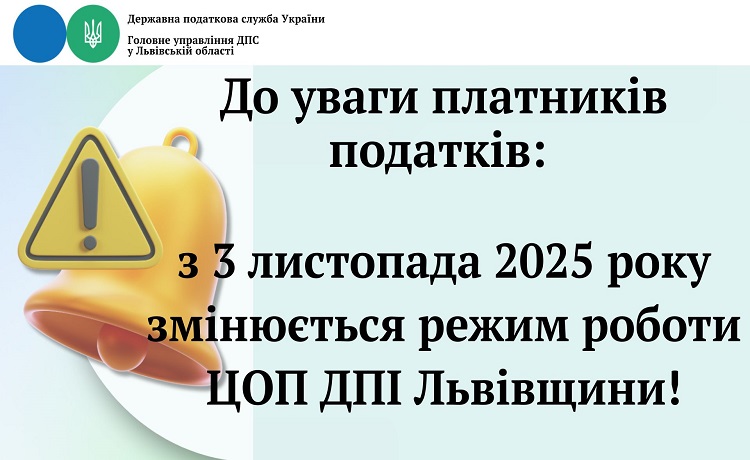 Головне управління ДПС у Львівській області звертає увагу платників податків, що з 3 листопада цього року змінюється режим роботи ЦОП ДПІ Головного управління ДПС у Львівській області, а саме, встановлено п’ятиденний робочий тиждень із тривалістю роботи по днях: з понеділка по четвер початок робочого дня - о 08 год.00 хв., перерва з 12 год.00 хв. до 12 год.45 хв., закінчення робочого дня – о 17 год.00 хв., у п’ятницю - початок робочого дня - о 08 год.00 хв., перерва з 12 год.00 хв. до 12 год.45 хв. закінчення робочого дня о 15 год.45 хв.