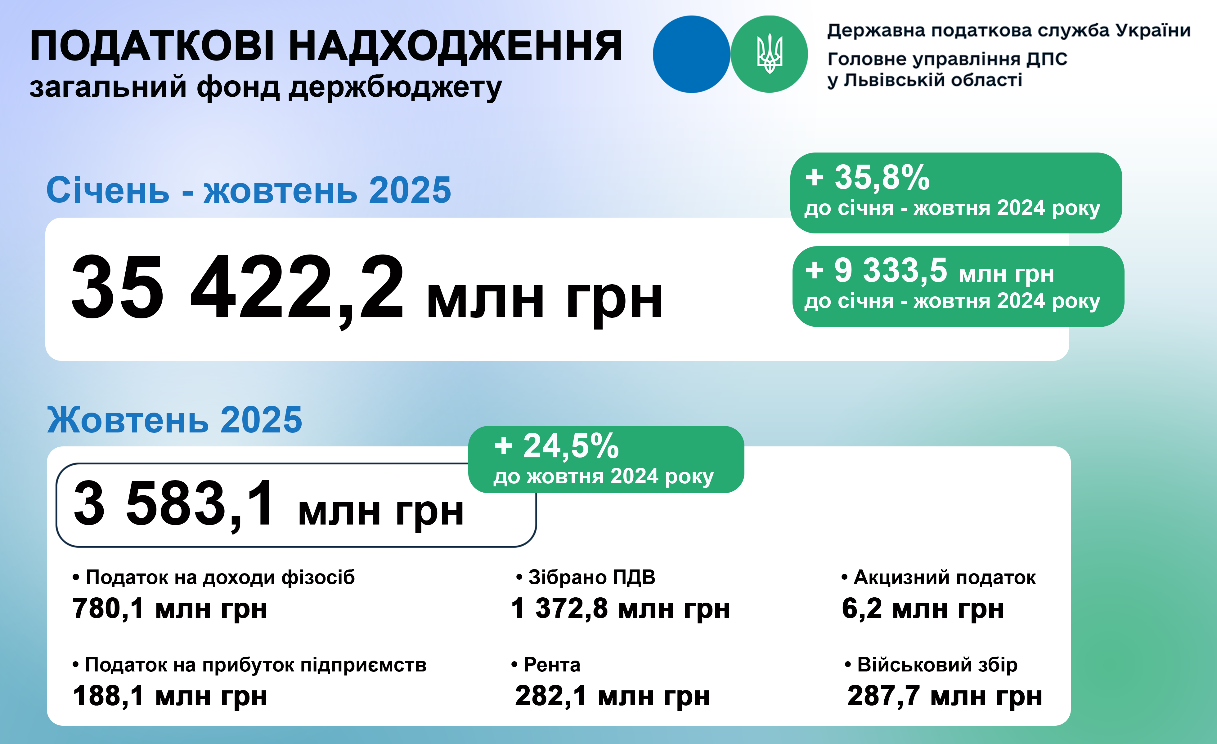 У січні-жовтні 2025 року Головним управлінням ДПС у Львівській області до загального фонду державного бюджету зібрано 35 422,2 млн грн податків, зборів, інших обов’язкових платежів. Порівняно з січнем-жовтнем 2024 року збір платежів до загального фонду державного бюджету збільшився на 35,8% або на 9 333,5 млн гривень. Про це повідомив начальник Головного управління ДПС у Львівській області Микола Никитюк.
