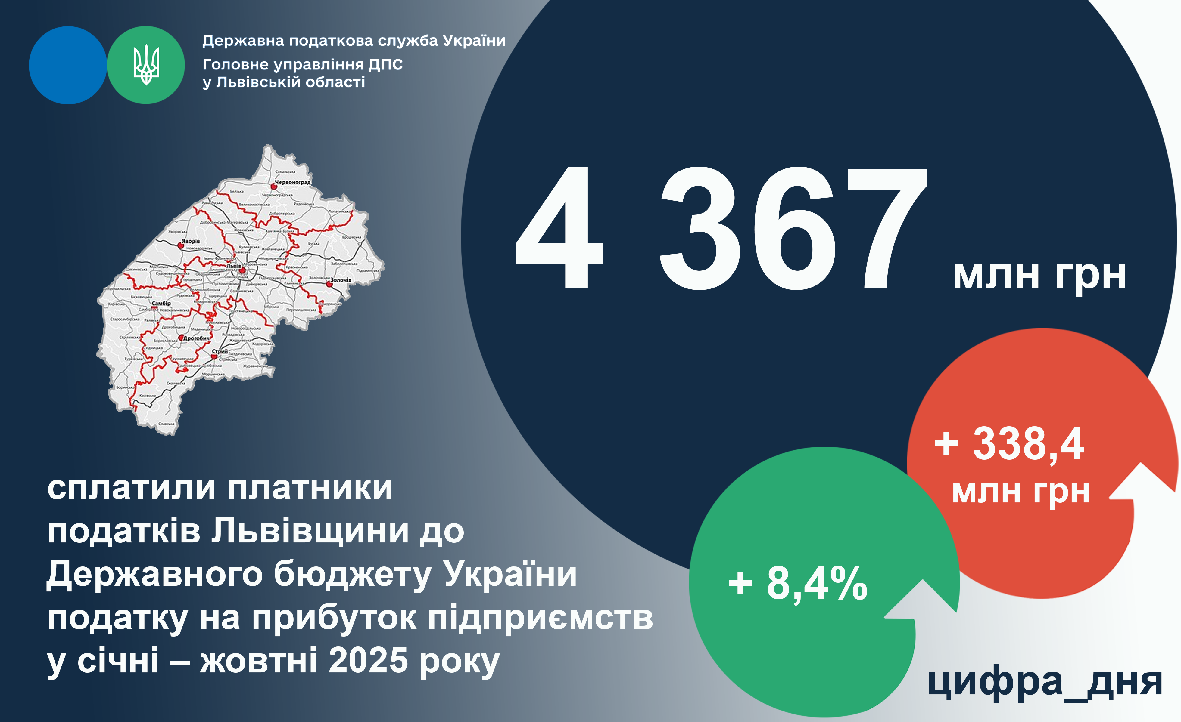 Упродовж січня – жовтня 2025 року податку на прибуток підприємств до державного бюджету надійшло від платників Львівщини 4 367,0 млн гривень. Це на 8,4% або на 338,4 млн гривень більше, ніж за відповідний період минулого року.