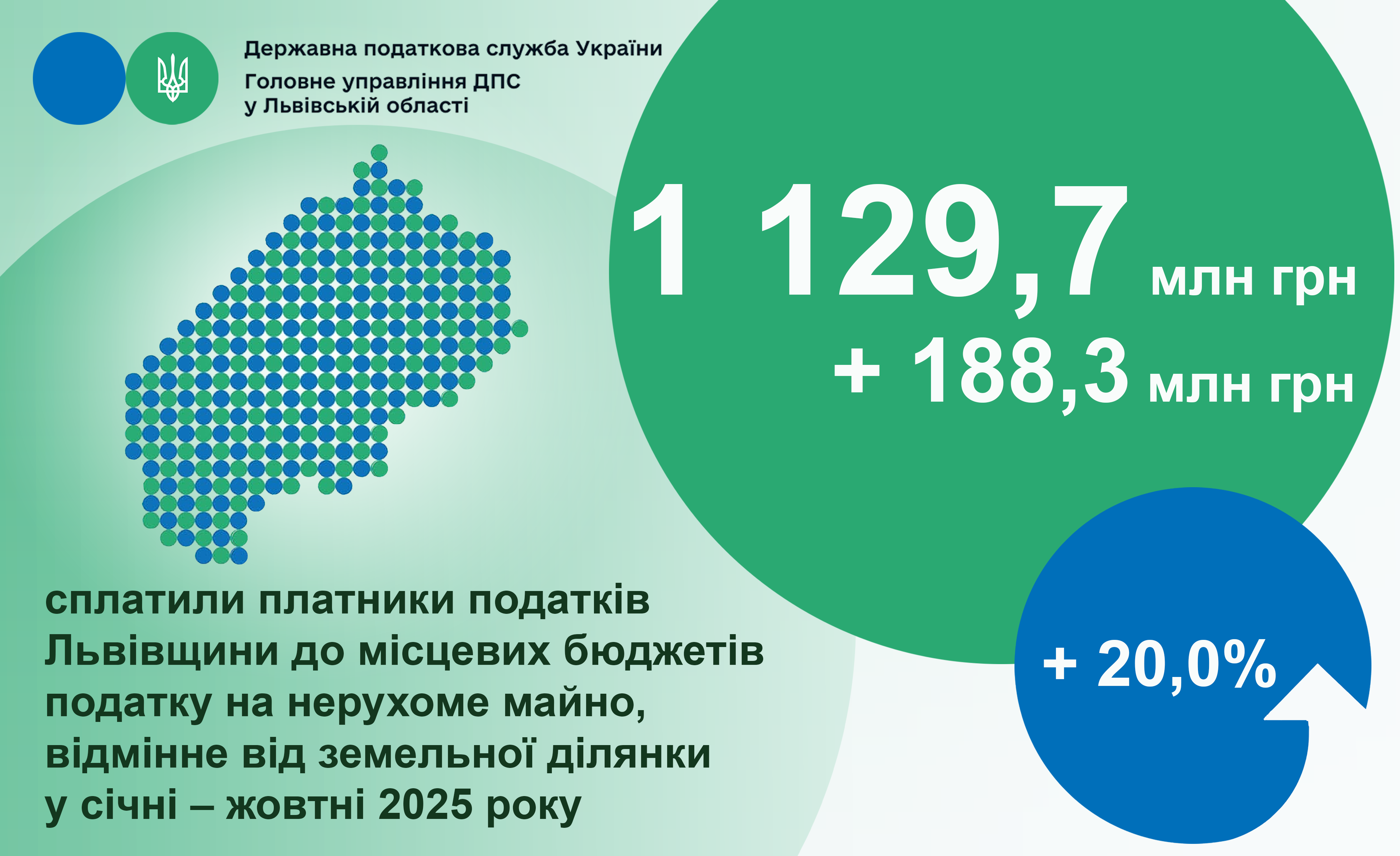 Упродовж січня – жовтня 2025 року до місцевих бюджетів Львівщини надійшло 1129,7 млн гривень податку на нерухоме майно, відмінне від земельної ділянки. Порівняно з відповідним періодом минулого року перераховано на 20% або на 188,3 млн гривень більше.