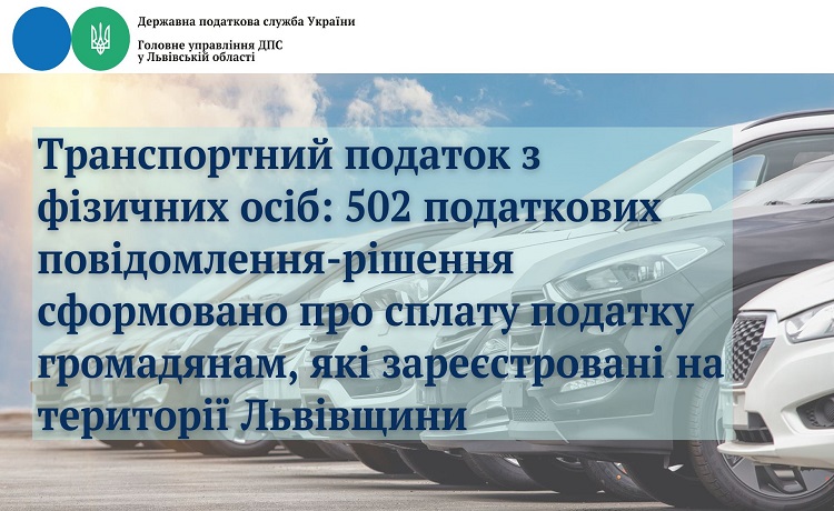 Як повідомили в управлінні оподаткування фізичних осіб Головного управління ДПС у Львівській області, станом на 01.11.2025 року Головним управлінням ДПС у Львівській області сформовано 502 податкових повідомлень-рішень про сплату транспортного податку з фізичних осіб по громадянах, які зареєстровані (прописані) на території Львівської області, на загальну суму 7,3 млн. гривень.
