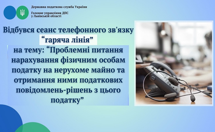 У Головному управлінні ДПС у Львівській області відбувся сеанс телефонного зв’язку ,,гаряча лінія” на тему: ,,Проблемні питання нарахування фізичним особам податку на нерухоме майно та отримання ними податкових повідомлень-рішень з цього податку”.