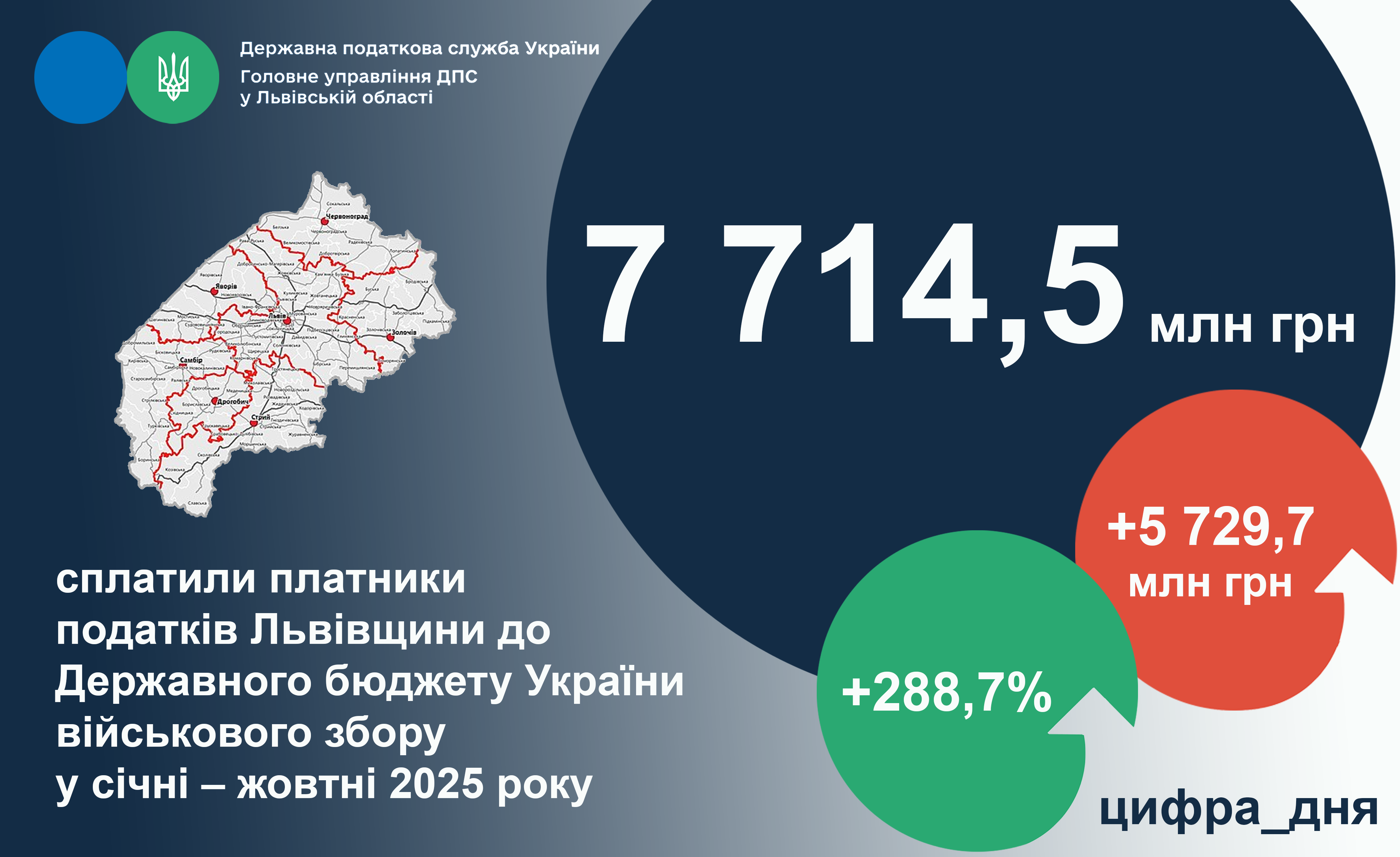 Як повідомив начальник Головного управління ДПС у Львівській області Микола Никитюк військового збору у січні-жовтні 2025 року надійшло 7 714,5 млн гривень, що на 288,7% або на 5 729,7 млн грн більше порівняно з січнем-жовтнем 2024 року.