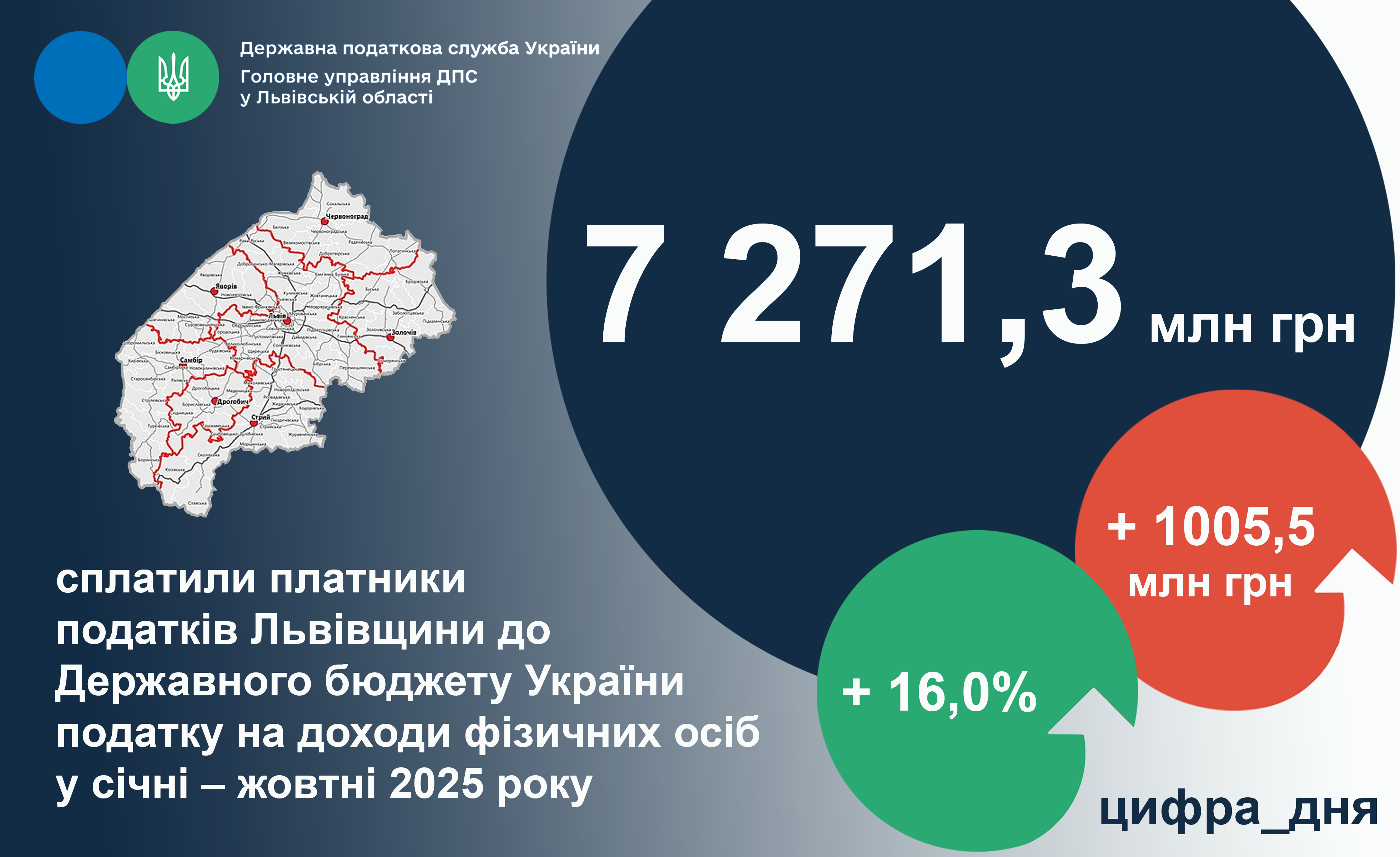 Як повідомив начальник Головного управління ДПС у Львівській області Микола Никитюк податку на доходи фізичних осіб у січні-жовтні 2025 року надійшло 7271,3 млн гривень. Порівняно з аналогічним періодом минулого року надходження збільшились на 16,0% або на 1 005,5 млн грн більше порівняно з січнем-жовтнем 2024 року.