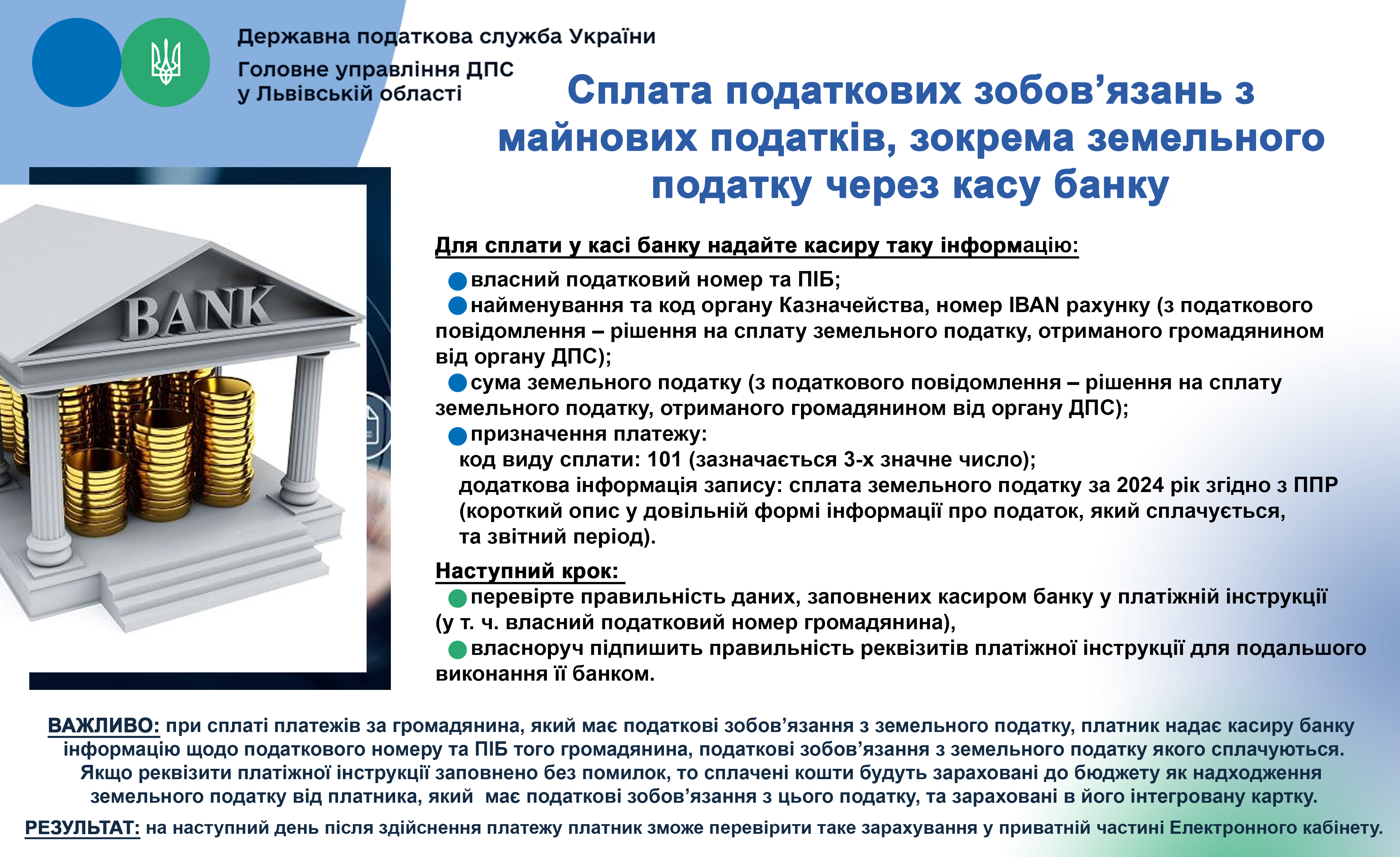 Сплата податкових зобов`язань з майнових податків, зокрема земельного податку через касу банку