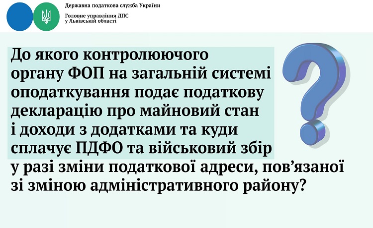 - До якого контролюючого органу ФОП на загальній системі оподаткування подає податкову декларацію про майновий стан і доходи з додатками та куди сплачує ПДФО та військовий збір у разі зміни податкової адреси, пов’язаної зі зміною адміністративного району?
