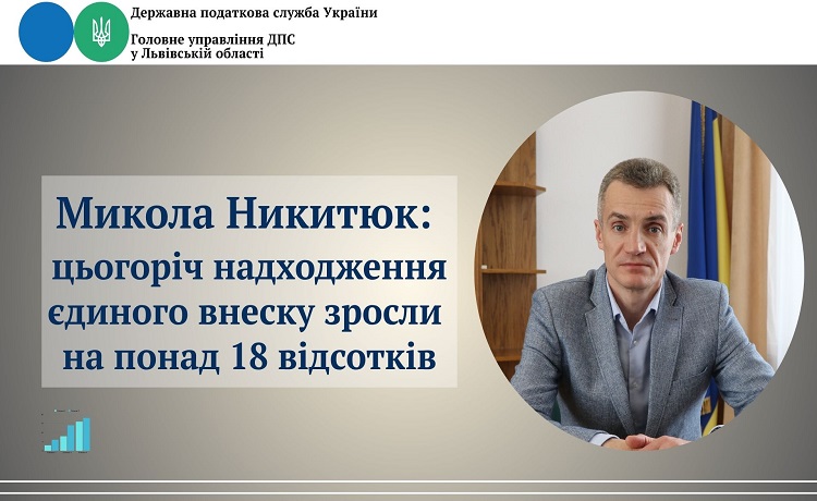 У січні-жовтні 2025 року фактичні надходження єдиного внеску на загальнообов'язкове державне соціальне страхування становили 27 864,4 млн гривень. Порівняно з аналогічним періодом минулого року надходження збільшились на 4327,3 млн гривень або на 18,4 відсотки. Про це повідомив начальник  Головного управління ДПС у Львівській області Микола Никитюк.