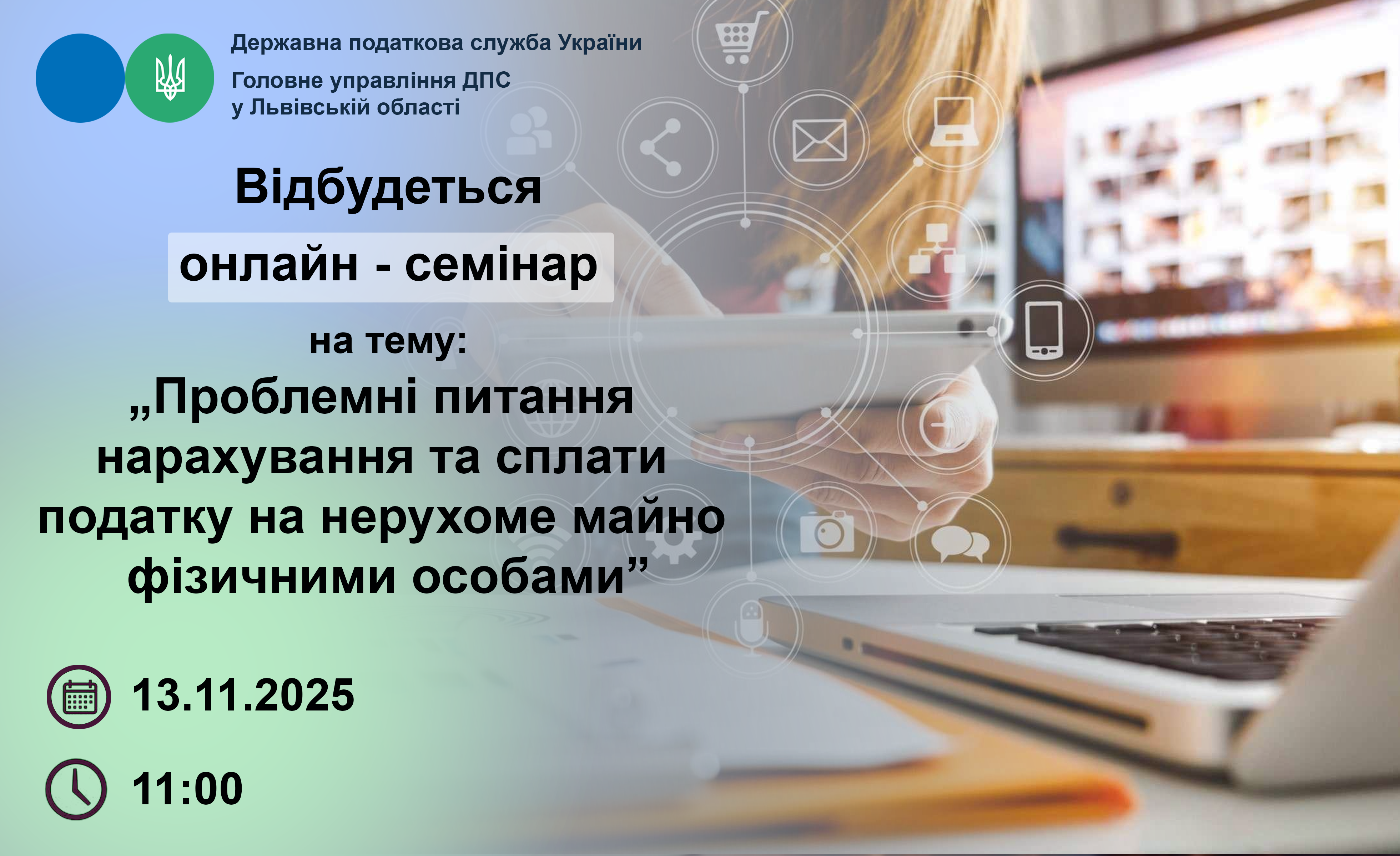 13 листопада 2025 року Головним управлінням ДПС у Львівській області буде проведено онлайн - семінар,  для платників податків Львівської області на тему: «Проблемні питання нарахування та сплати податку  на нерухоме майно фізичними особами».