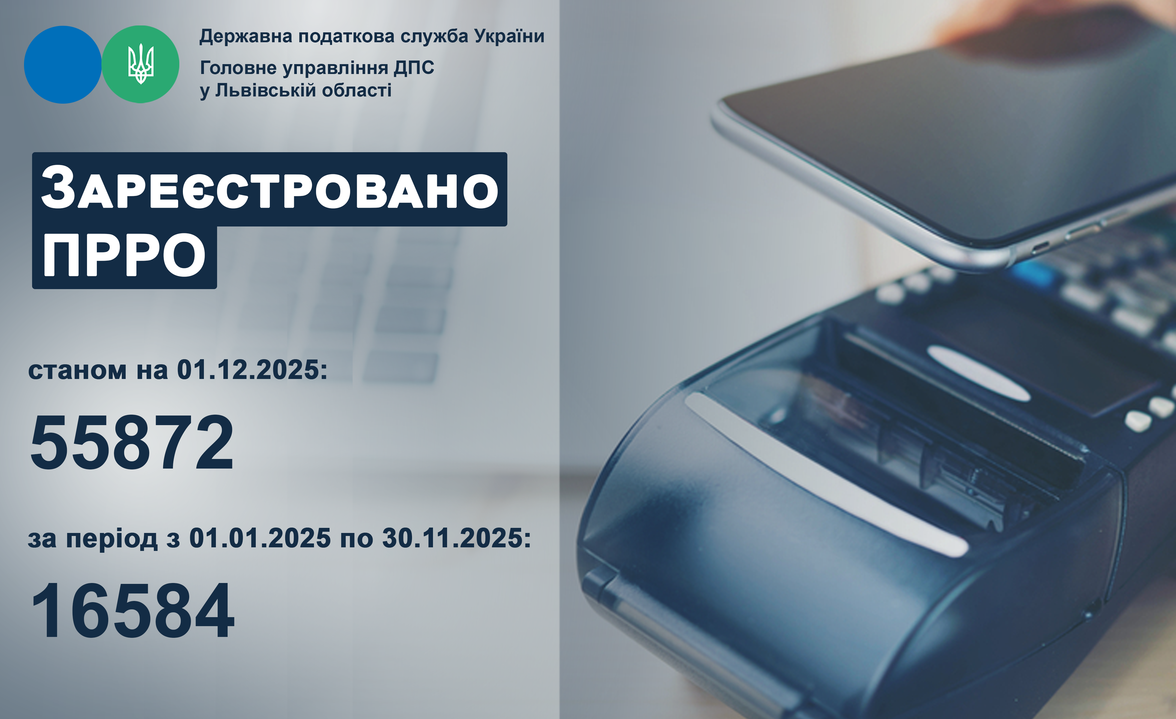 Головне управління ДПС у Львівській області інформує, що станом на 01.12.2025 року було зареєстровано 55872 ПРРО.