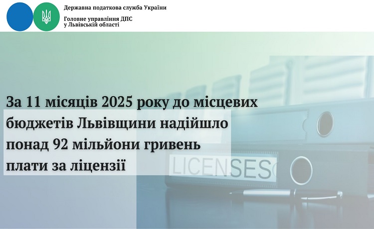 Упродовж січня-листопада 2025 року надходження до місцевих бюджетів по платі за ліцензії, що контролюють податкові органи, становлять 92,2 млн грн або 124 відс. доведеного завдання (додатково надійшло 17,9 млн гривень), та на 12,7млн гривень або на 16 відсотків більше порівняно з минулим роком.