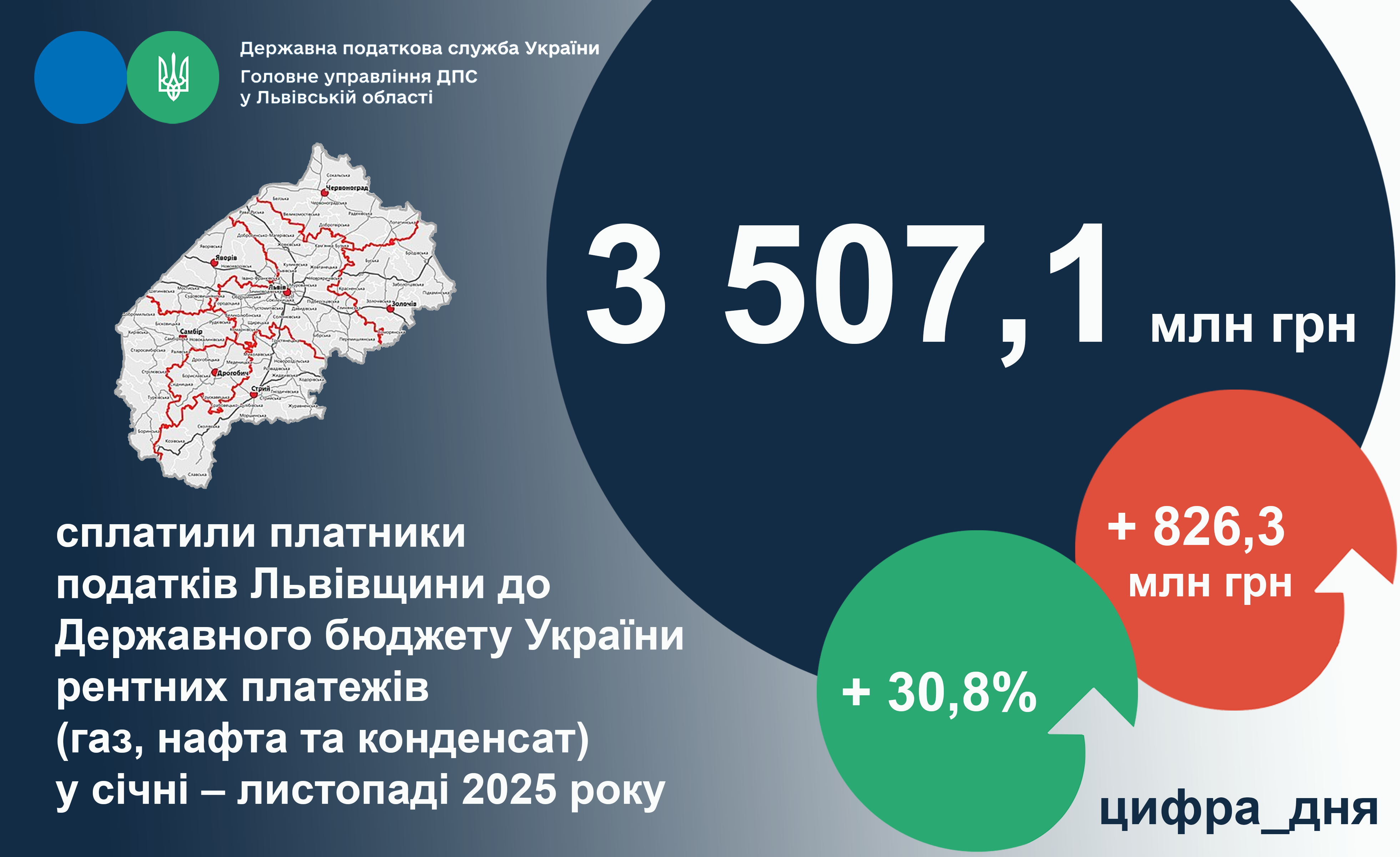 Рентних платежів (газ, нафта та конденсат) у січні-листопаді 2025 року надійшло до державного бюджету від Львівської області 3 507,1 млн гривень. Порівняно з січнем-листопадом 2024 року надходження збільшились на 30,8% або на 826,3 млн гривень. Про це повідомив начальник Головного управління ДПС у Львівській області Микола Никитюк.