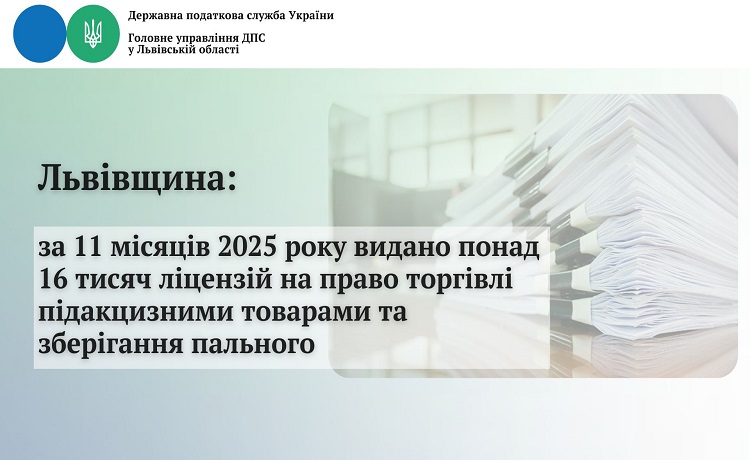 Упродовж січня-листопада 2025 року видано 16 096 ліцензій на право торгівлі підакцизними товарами та зберігання пального, внесено змін до відомостей, що містяться в Єдиному реєстрі ліцензіатів – 2 585 ліцензій на право торгівлі підакцизними товарами та зберігання пального, внесено 22 370 чергових платежів за ліцензії, внесено 77 місць зберігання алкогольних напоїв та тютюнових виробів до Єдиного реєстру місць зберігання та припинено дію 3 092 ліцензій, що на 348 ліцензій більше, ніж за аналогічний період 2024 року.