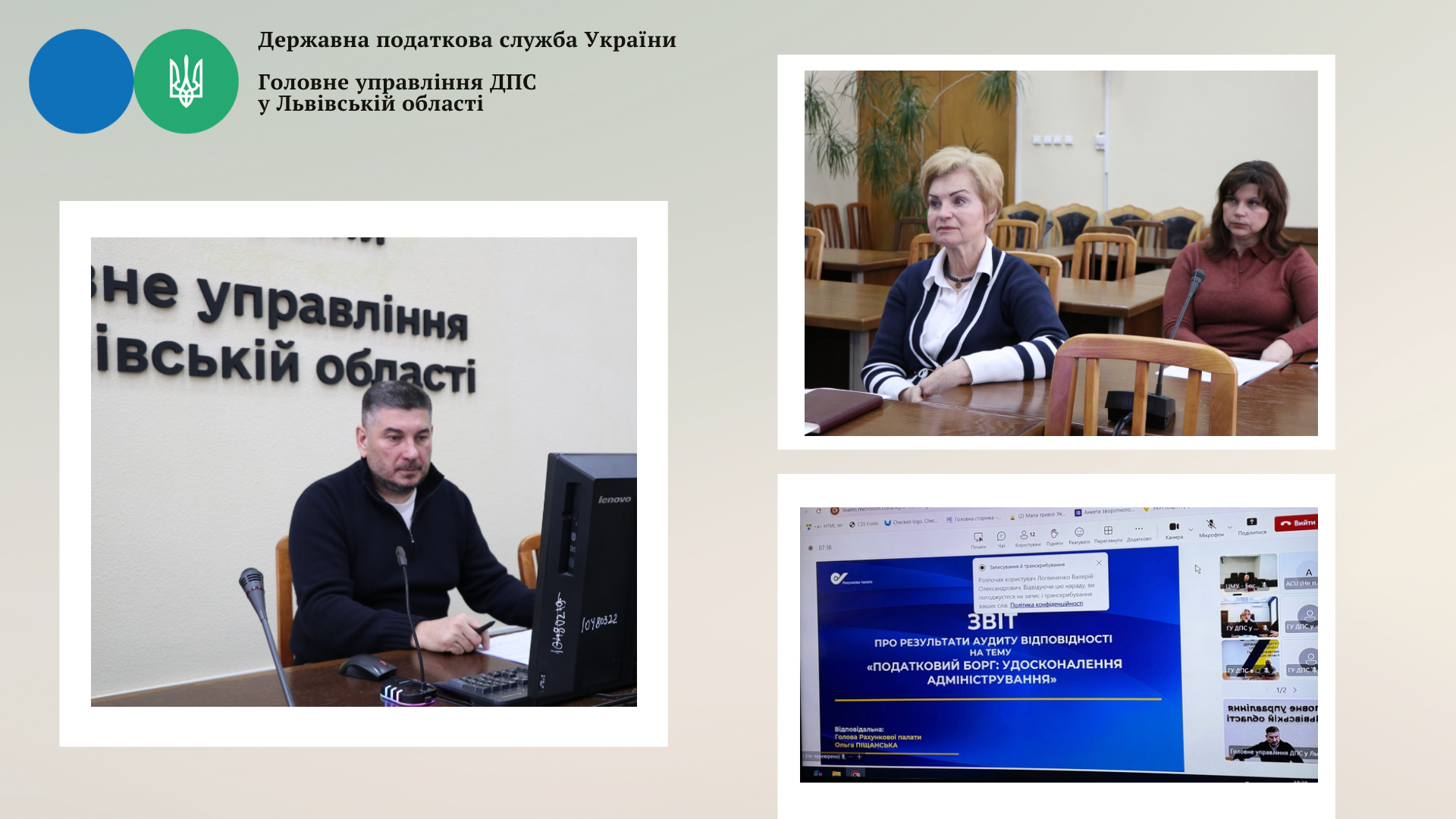 Сьогодні заступник начальника Головного управління ДПС у Львівській області Руслан Ганюк, начальник управління по роботі з податковим боргом Елеонора Матюшко, начальник відділу організації стягнення боргу та роботи з безхазяйним майном управління по роботі з податковим боргом Роксолана Сапрука взяли участь у засіданні Рахункової палати, на якому розглядався Звіт про результати аудиту відповідності на тему «Податковий борг: удосконалення адміністрування». Засідання відбулося у режимі відеоконференції.