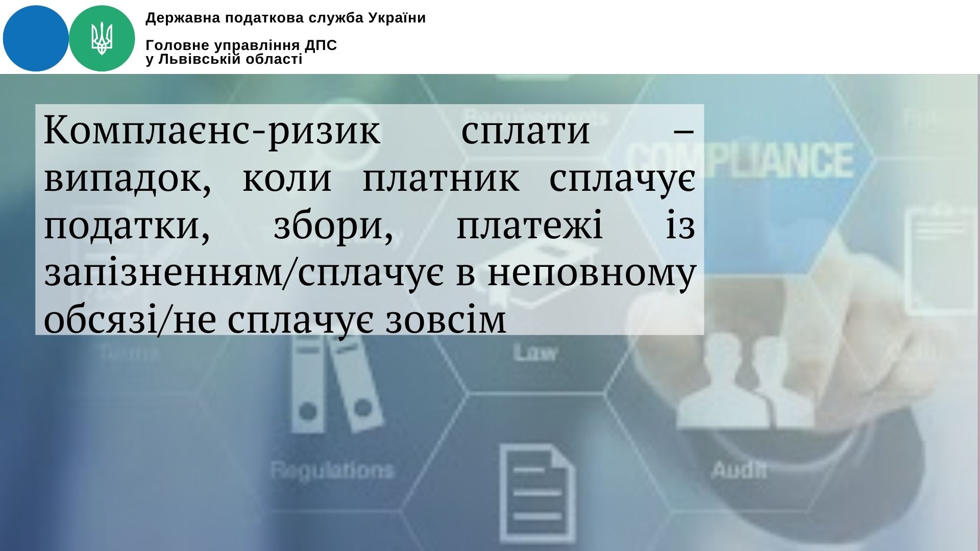 Щодо комплаєнс-ризику сплати – це випадок, коли платники податків сплачують податки, збори, платежі із запізненням або сплачують в неповному обсязі, або не сплачують зовсім, що призводить до виникнення або накопичення податкового боргу.