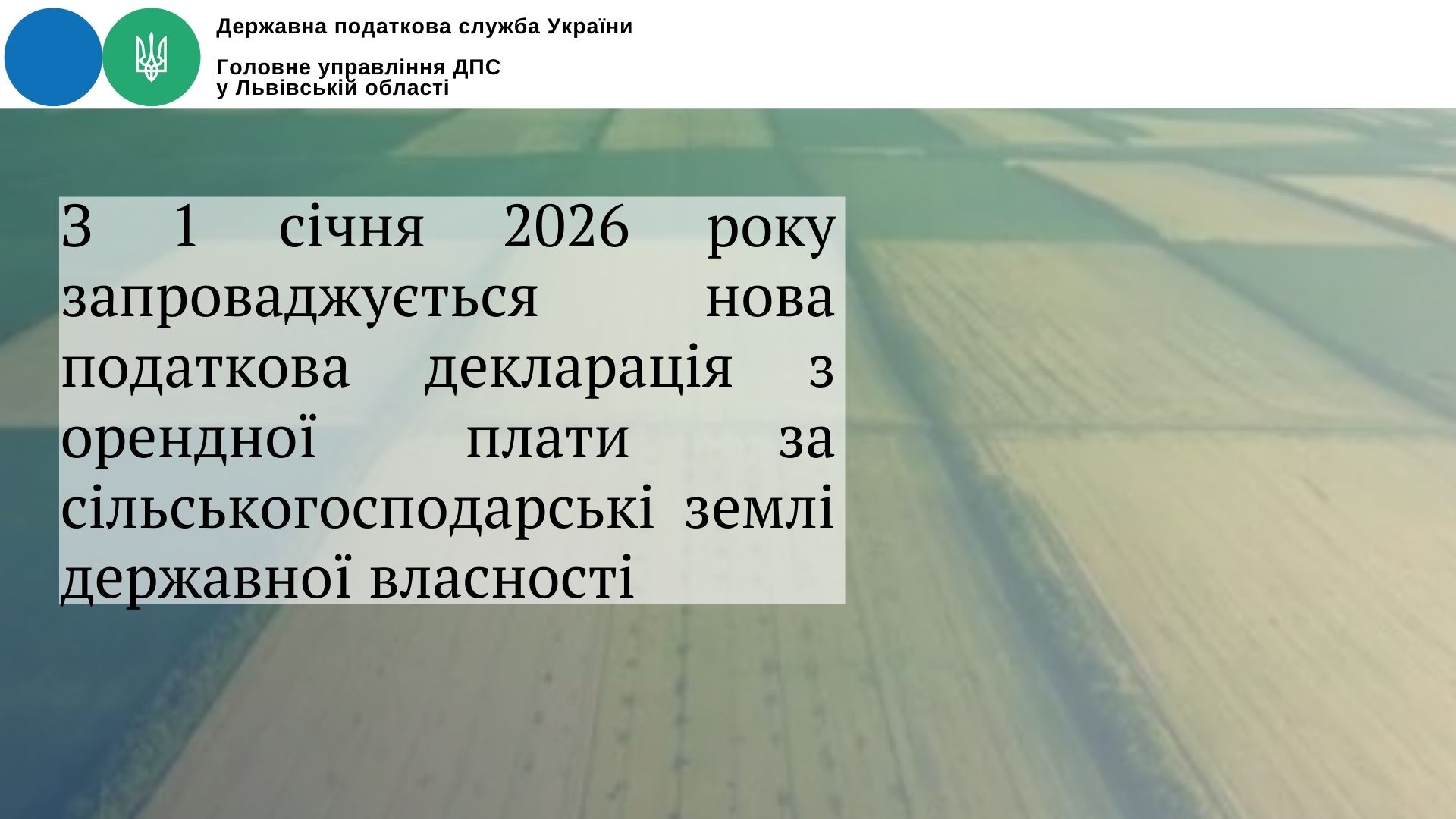 Головне управління ДПС у Львівській області звертає увагу, що з 1 січня 2026 року запроваджується нова форма податкової декларації з орендної плати для земельних ділянок сільськогосподарського призначення державної власності.