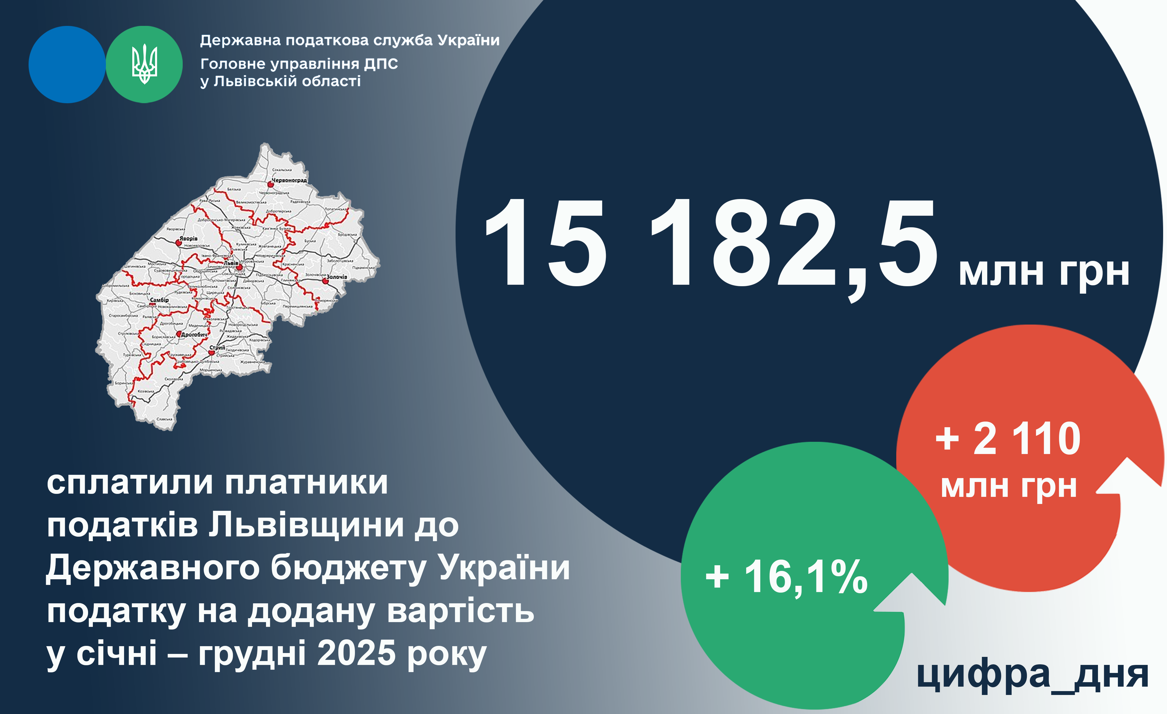 Львівщина: за дванадцять місяців 2025 року до державного бюджету надійшло понад 15 млрд гривень податку на додану вартість