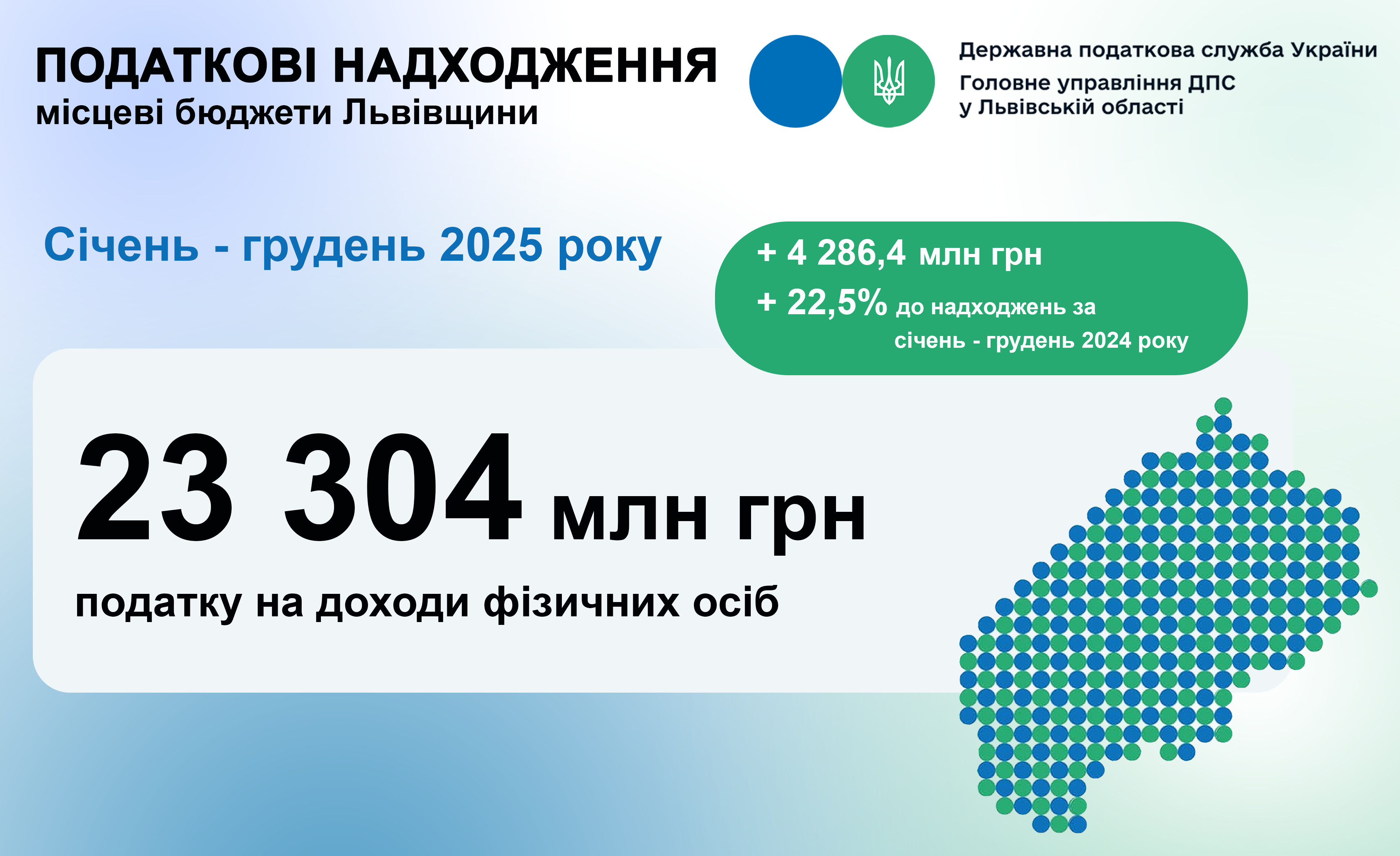 Упродовж дванадцяти місяців 2025 року по податку на доходи фізичних осіб надходження до місцевих бюджетів Львівщини становили 23 304 млн гривень. Порівняно з відповідним періодом минулого року вони збільшилися на 22,5% або на 4 286,4 млн гривень. Про це повідомив начальник Головного управління ДПС у Львівській області Микола Никитюк. У грудні 2025 року надходження по ПДФО до місцевих скарбниць краю становили 2 638,4 млн гривень, що на 21,7% або на 470,8 млн гривень більше, ніж у грудні 2024 року.