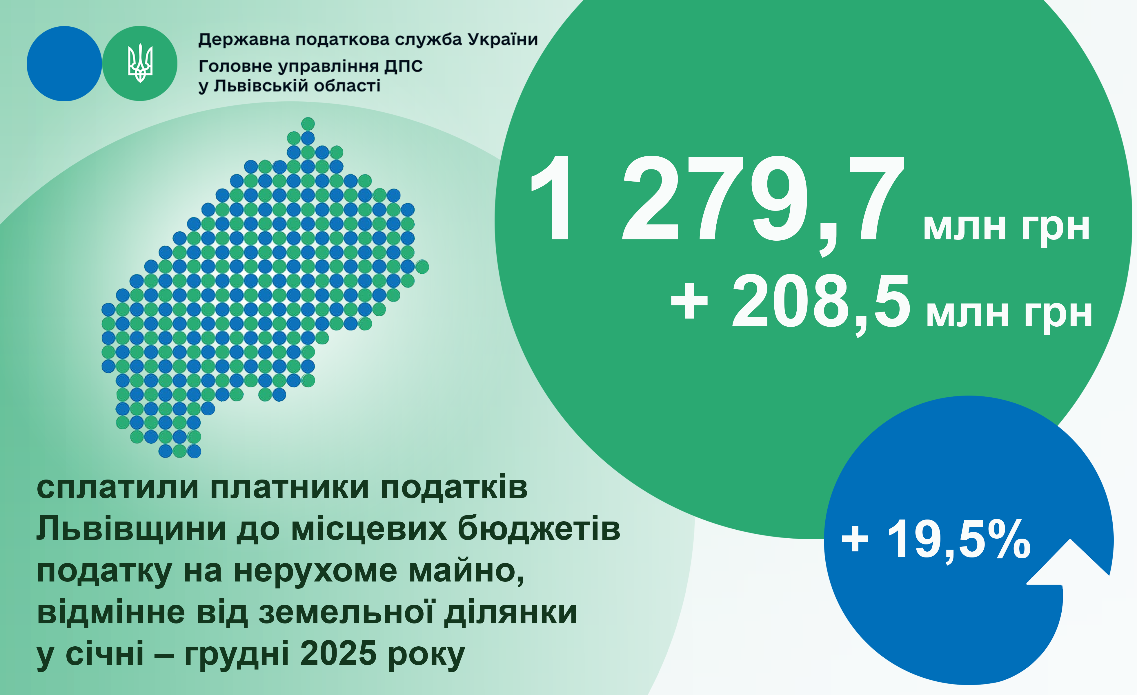 Надходження податку на нерухоме майно, відмінне від земельної ділянки, до місцевих бюджетів Львівської області у січні-грудні 2025 року становили 1279,7 млн гривень. Порівняно з відповідним періодом 2024 року надходження збільшились на 19,5% або на 208,5 млн гривень.