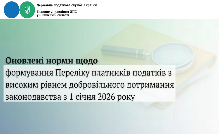 Головне управління ДПС у Львівській області звертає увагу, що з 1 січня 2026 року в Україні діють оновлені норми Податкового кодексу, що стосуються формування Переліку платників податків з високим рівнем добровільного дотримання законодавства.