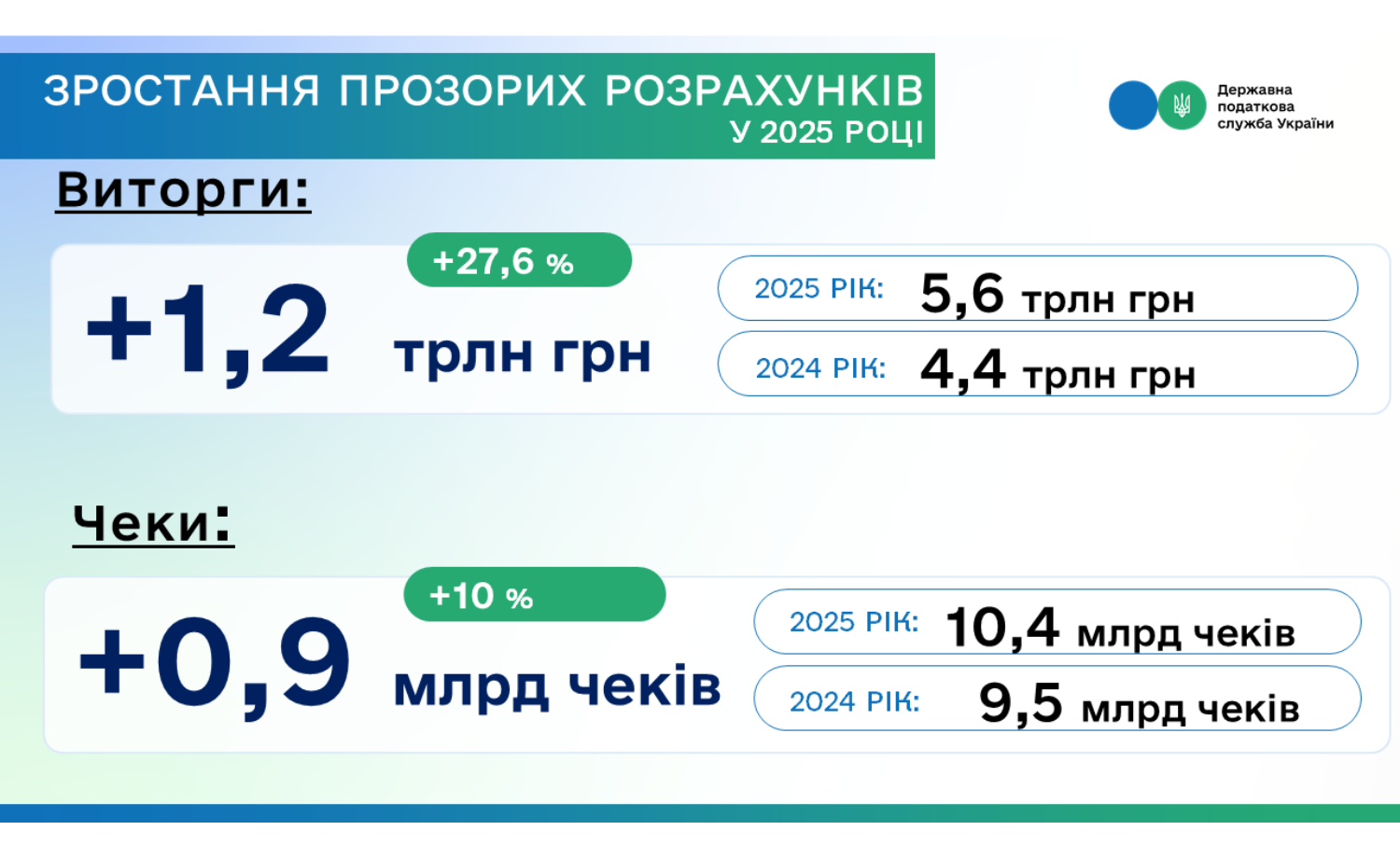 Офіційні розрахунки у 2025 році зросли майже на третину: загалом сформовано 10,4 млрд чеків