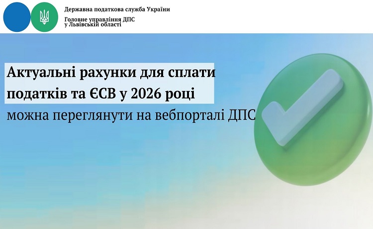 Головне управління ДПС у Львівській області нагадує, що реквізити рахунків для податкових платежів та єдиного внеску на 2026 рік опубліковано на вебпорталі ДПС або на субсайті Головного управління ДПС області у розділі «Рахунки для сплати платежів» на вебпорталі ДПС за посиланнями: https://tax.gov.ua/rahunki-dlya-splati-platejiv , https://lv.tax.gov.ua/rahunki-dlya-splati-platejiv